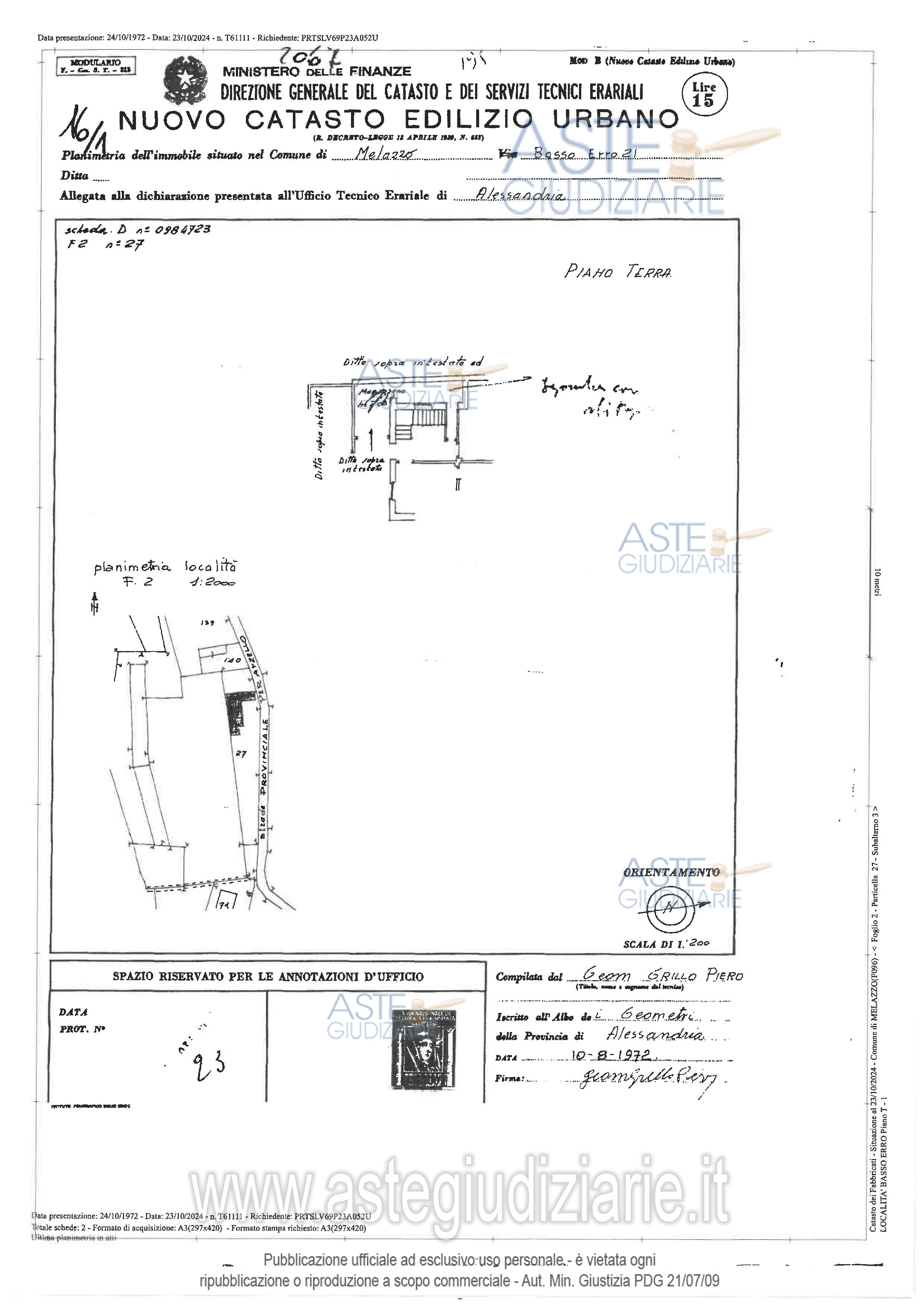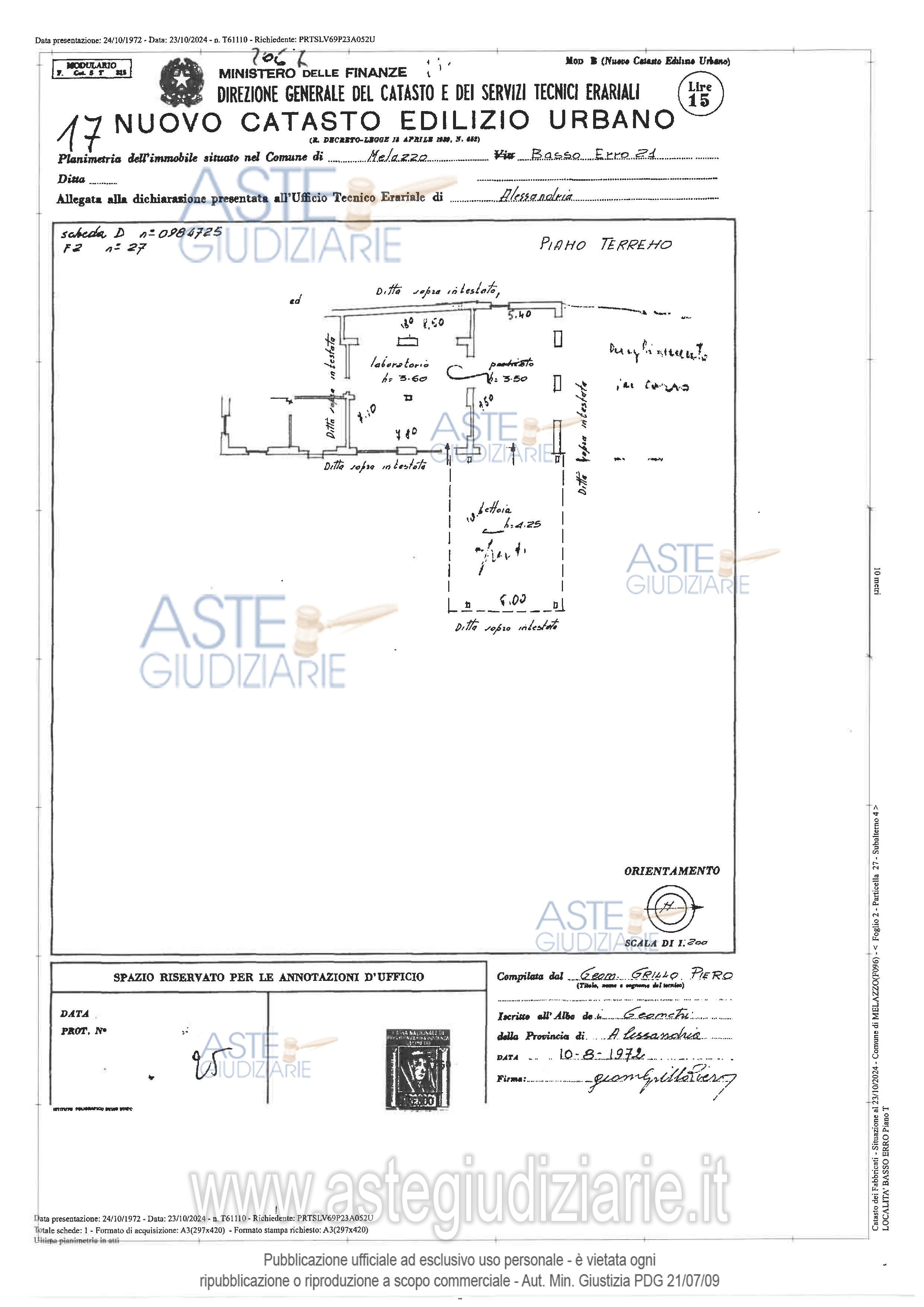 Vendita all'asta Senza incanto, con gara telematica asincrona - LOTTO UNICO: Fabbricato in parte adibito ad abitazione civile, in parte adibito a laboratorio artigianale su due piani f.t. Abitazione composta da: al p.t. 1 locale deposito, 1 magazzino, 1 cantina, 2 locali deposito, 1 bagno, 2 vani scala; al p.1 un cucinino, 1 tinello/soggiorno, un corridoio/disimpegno, 1 ripostiglio, 6 camere, 2 servizi igienici, 2 vani scala. Laboratorio al pt composto da 3 locali + 1 uso ufficio, 1 locale sgombero abusivamente attrezzato a open space, 1 serv. igienico, 1 locale accessorio/tettoia. Prezzo base € 73.406,25 (offerta minima € 55.054,69). Data inizio operazioni di vendita: 25/02/2026 ore 16:00. Professionista delegato alla vendita Avv. Elena Piroddi - Email "elenapiroddi@gmail.com"; Cell. 3404137266; Tel. 0144356222. Custode Giudiziario Avv. Elena Piroddi - Email "elenapiroddi@gmail.com"; Cell. 3404137266; Tel. 0144356222. Rif. Tribunale di Alessandria - Espropriazione immobiliare (cartabia) n. 251/2024
