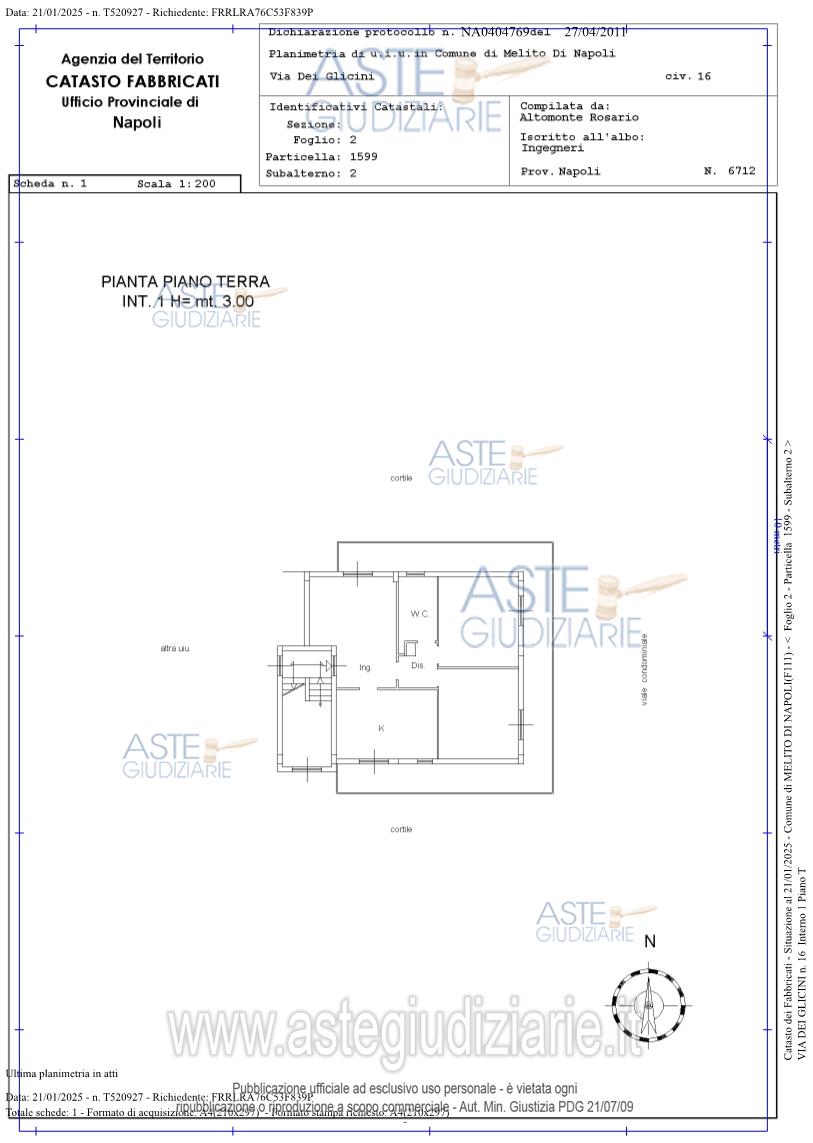 Vendita all'asta Senza incanto, con gara telematica asincrona - LOTTO UNICO: Piena ed esclusiva proprietà di appartamento sito in Melito di Napoli (NA) alla via Dei Glicini n. 16, piano rialzato (piano T. al catasto), int. 1, ubicato in un fabbricato di tre piani fuori terra ed uno seminterrato. Dotato di tripla esposizione nord-est e sud. Composto di ingresso-soggiorno, due camere, cucina, disimpegno, bagno ed ampia balconata. Valore d'uso. Prezzo base € 54.000,00 (offerta minima € 40.500,00). Data inizio operazioni di vendita: 09/06/2026 ore 14:30. Professionista delegato alla vendita Avv. Marco D'arcangelo - Email "marcodarca1974@gmail.com"; Tel. 0810491814. Custode Giudiziario Avv. Marco D'arcangelo - Email "marcodarca1974@gmail.com"; Tel. 0810491814. Rif. Tribunale di Napoli Nord - Espropriazione immobiliare (cartabia) n. 432/2024