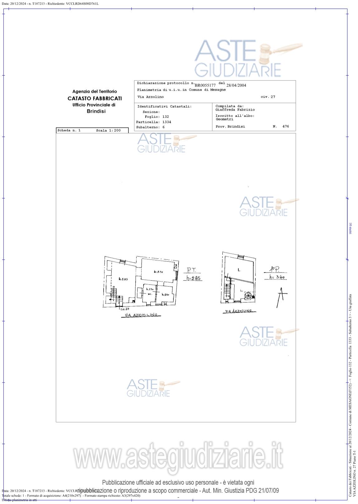 Vendita all'asta Senza incanto, con gara telematica asincrona - LOTTO UNICO: Appartamento sito in Mesagne (BR), Via Degli Azzolino, 27, quartiere Centro Storico, della superficie commerciale di 133,00 mq, per la quota di 1/1 di piena proprietà. Prezzo base € 55.900,00 (offerta minima € 41.925,00). Data inizio operazioni di vendita: 01/12/2025 ore 10:30. Professionista delegato alla vendita Avv. Milena D'ambrosio - Email "dambrosio-milena@libero.it"; Cell. 3334551954. Custode Giudiziario Avv. Milena D'ambrosio - Email "dambrosio-milena@libero.it"; Cell. 3334551954. Rif. Tribunale di Brindisi - Esecuzione immobiliare post legge 80 n. 82/2024