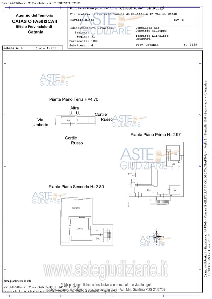 Vendita all'asta Senza incanto, con gara telematica sincrona mista - LOTTO UNICO: Immobile destinato a civile abitazione posto in Militello val di Catania Cortile Russo n. 8 composto da piano terra,primo e secondo piano. Prezzo base € 47.981,25 (offerta minima € 35.985,93). Data vendita 29/05/2026 ore 16:00. Giudice Agata Maria Patrizia Cavallaro. Professionista delegato alla vendita Avv. Avv. Daniela Cosolito - Email "danielacosolito1969@gmail.com"; Cell. 3343881760; Tel. 093326830. Custode Giudiziario Avv. Avv. Daniela Cosolito - Email "danielacosolito1969@gmail.com"; Cell. 3343881760; Tel. 093326830. Rif. Tribunale di Caltagirone - Esecuzione immobiliare post legge 80 n. 10/2022
