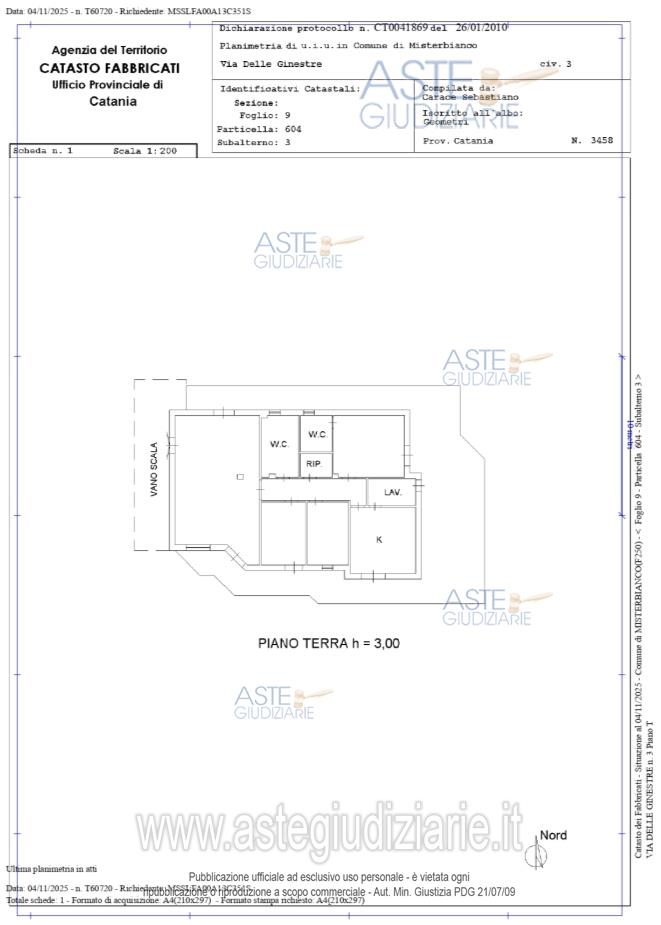 Vendita all'asta Senza incanto, con gara telematica sincrona mista - LOTTO UNICO: Unità immobiliare in Misterbianco (CT) alla via delle Ginestre n. 3 composta da appartamento al piano terra, composto da sei vani e mezzo catastali, confinante: a nord, est e sud con area condominiale e ad ovest con vano scala, salvi altri e più attuali confini. In Catasto fabbricati del Comune di Misterbianco al Foglio 9 particella 604 sub 3, piano T, categoria A/2, classe 5, vani 6,5, sup. 169 mq di cui 154 mq escluse aree scoperte, R.C.E. 469,98. Prezzo base € 110.000,00 (offerta minima € 110.000,00). Data vendita 11/03/2026 ore 17:30. Professionista delegato alla vendita Dott. Carmelo Accolla - Email "studioaccolla@gmail.com"; Tel. 095436443. Rif. Tribunale di Catania - Ricorso liquidazione controllata n. 505/2024