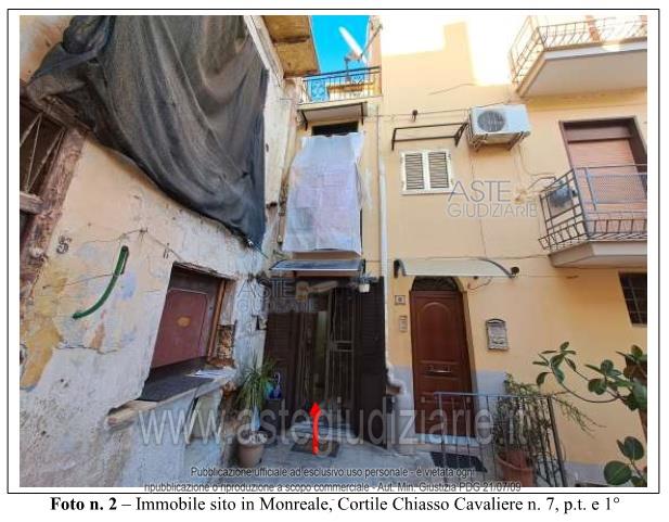 Vendita all'asta Senza incanto, con gara telematica sincrona mista - LOTTO UNICO: 1/1 appartamento ubicato in Monreale (PA), Cortile Chiasso Cavaliere n. 7, piano terra, primo piano e lastrico solare/terrazzo accessibile in edificio indipendente e non in condominio.L’appartamento è così composto: - al piano terra da: cucina soggiorno non disimpegnata dall’ingresso, w.c. privo di finestra, piccolo ripostiglio in sottoscala.- al primo piano da: zona di disimpegno, n. 2 camere da letto prive di finestra e w.c./lavanderia anch’esso privo di finestra.Il collegamento tra il piano terra ed il primo piano avviene per il tramite di corpo scala interno. E’ possibile accedere al lastrico solare costituente la copertura del fabbricato per il tramite di scala a chiocciola e torrino.