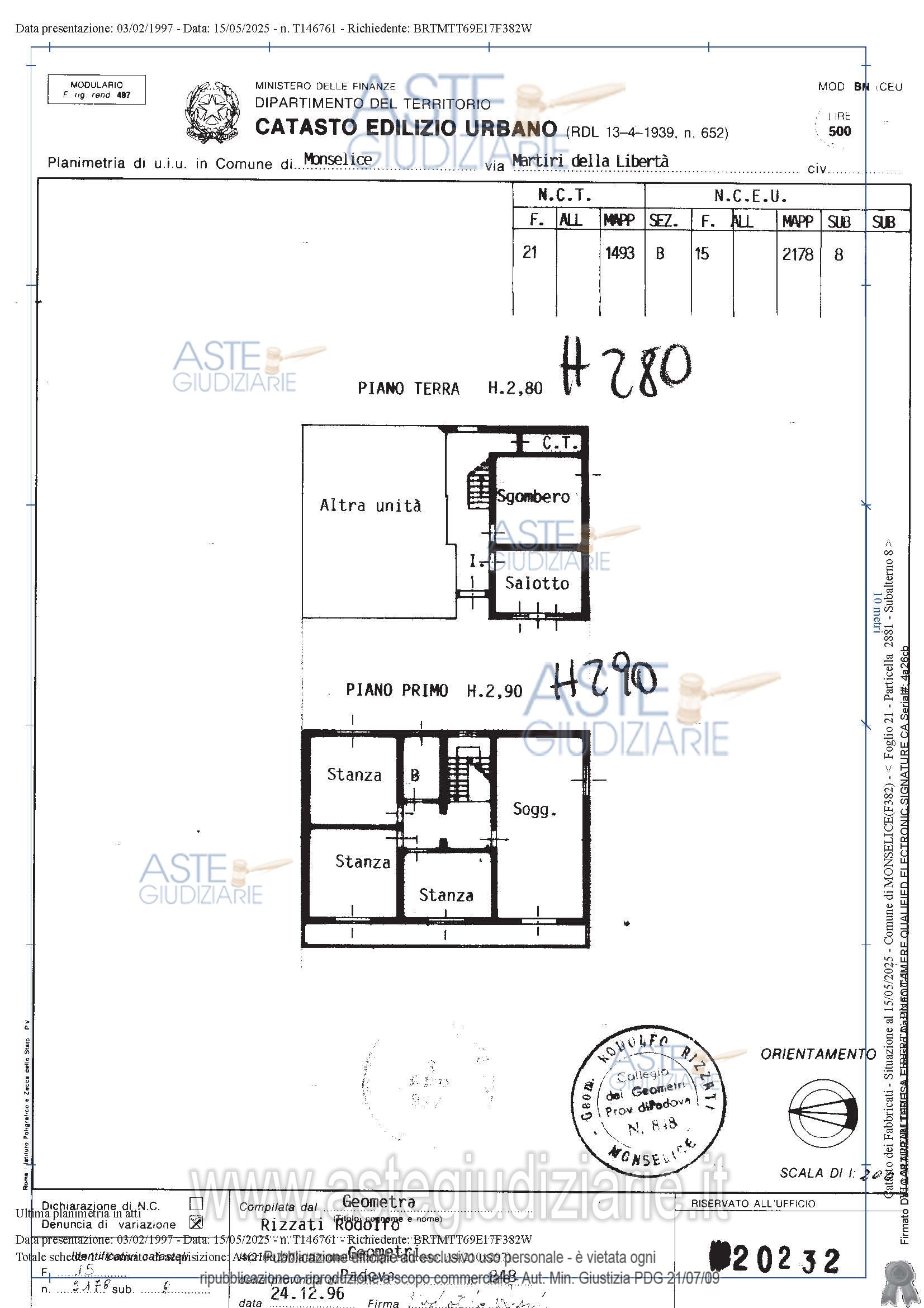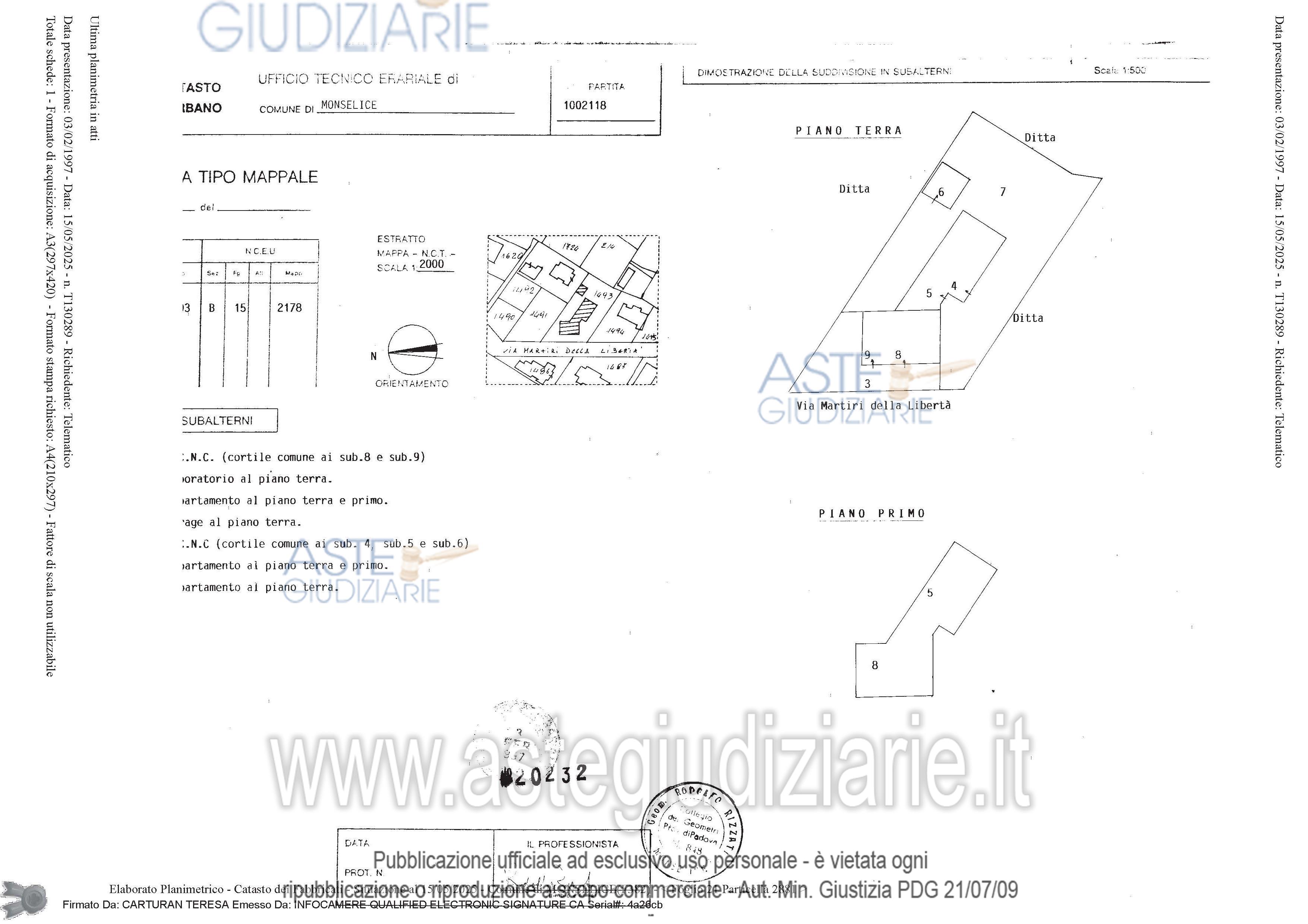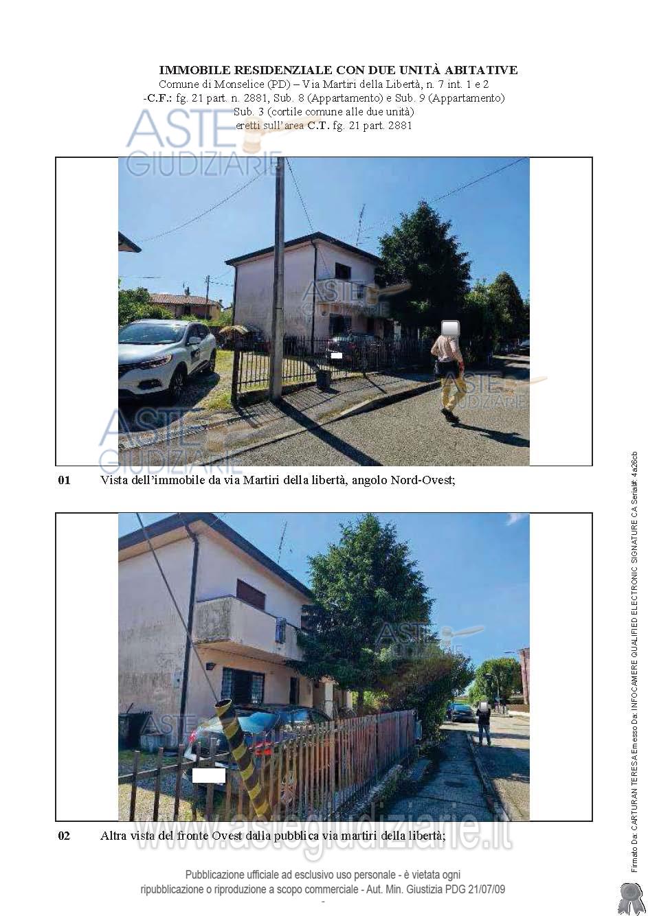 Vendita all'asta Senza incanto, con gara telematica sincrona - LOTTO UNICO: Lotto unico - piena proprietà di fabbricato residenziale, sito in Comune di Monselice (PD), via Martiri della Libertà n. 7 int. 1 (sub. 8) e int. 2 (sub 9), in zona semicentrale, parzialmente accostato sul lato est ad altro edificio e composto da un appartamento sviluppato ai piani terra e primo di commerciali mq. 179, un secondo appartamento al solo piano terra, di commerciali mq. 63, oltre al cortile comune ad entrambe le unità di mq. 153. In corso di liberazione (Sub. 8). Occupato con titolo (Sub. 9). Prezzo base € 190.000,00 (offerta minima € 143.000,00). Data vendita 14/04/2026 ore 14:15. Giudice Pasqualetto. Professionista delegato alla vendita Dott. Francesco Mario Roberto Savio - Email "visiteimmobili@fsst.it"; Tel. 0498762588. Custode Giudiziario Dott. Francesco Mario Roberto Savio - Email "visiteimmobili@fsst.it"; Tel. 0498762588. Rif. Tribunale di Padova - Espropriazione immobiliare (cartabia) n. 69/2025