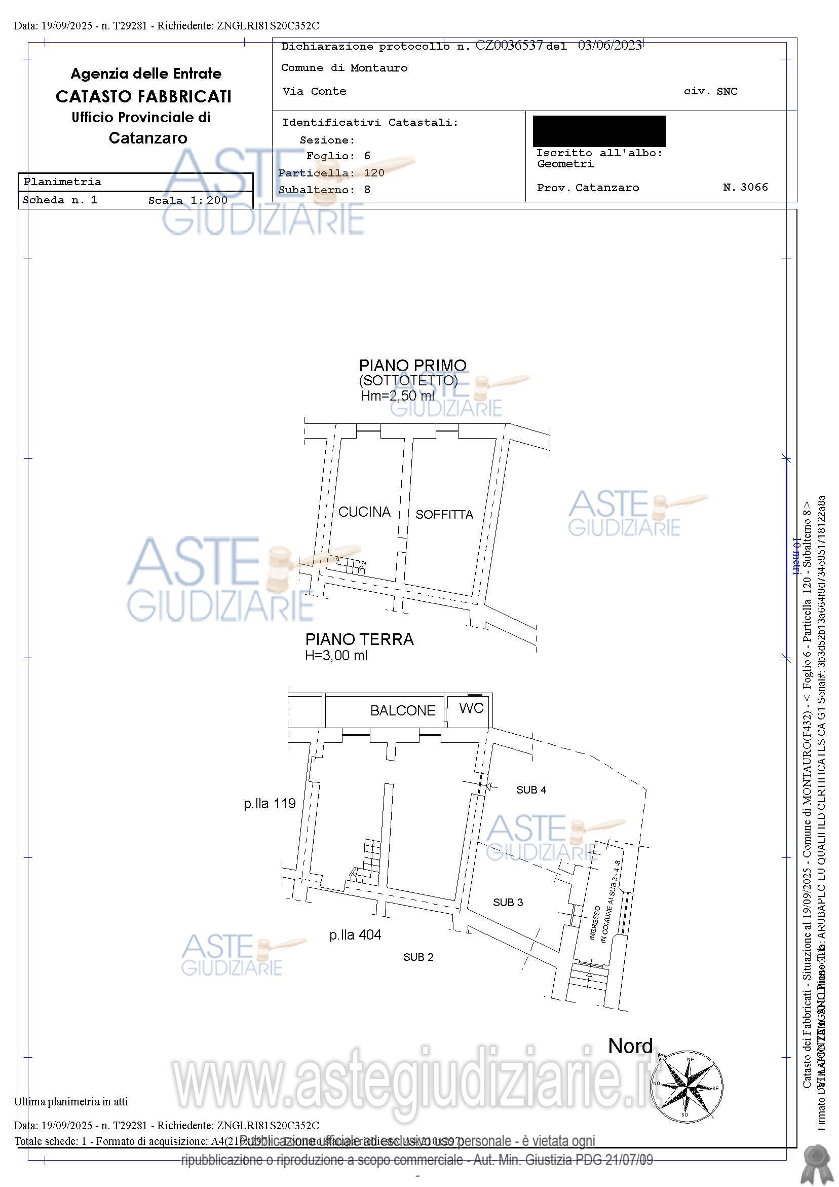 Vendita all'asta Senza incanto, con gara telematica asincrona - LOTTO 2: Piena proprietà dell’immobile sito nel Comune di Montauro (CZ) alla Via Conte snc piano terra e piano primo, identificato nel N.C.E.U. al Foglio 6 Particella 120 – Sub 8, Categoria A3 Classe 1, Consistenza 3,5 vani, rendita € 162,68, superficie complessiva lorda circa mq 123. L’immobile si presenta in fase diristrutturazione. Prezzo base € 13.000,00 (offerta minima € 9.750,00). Data inizio operazioni di vendita: 23/06/2026 ore 09:30. Giudice: Song Damiani.