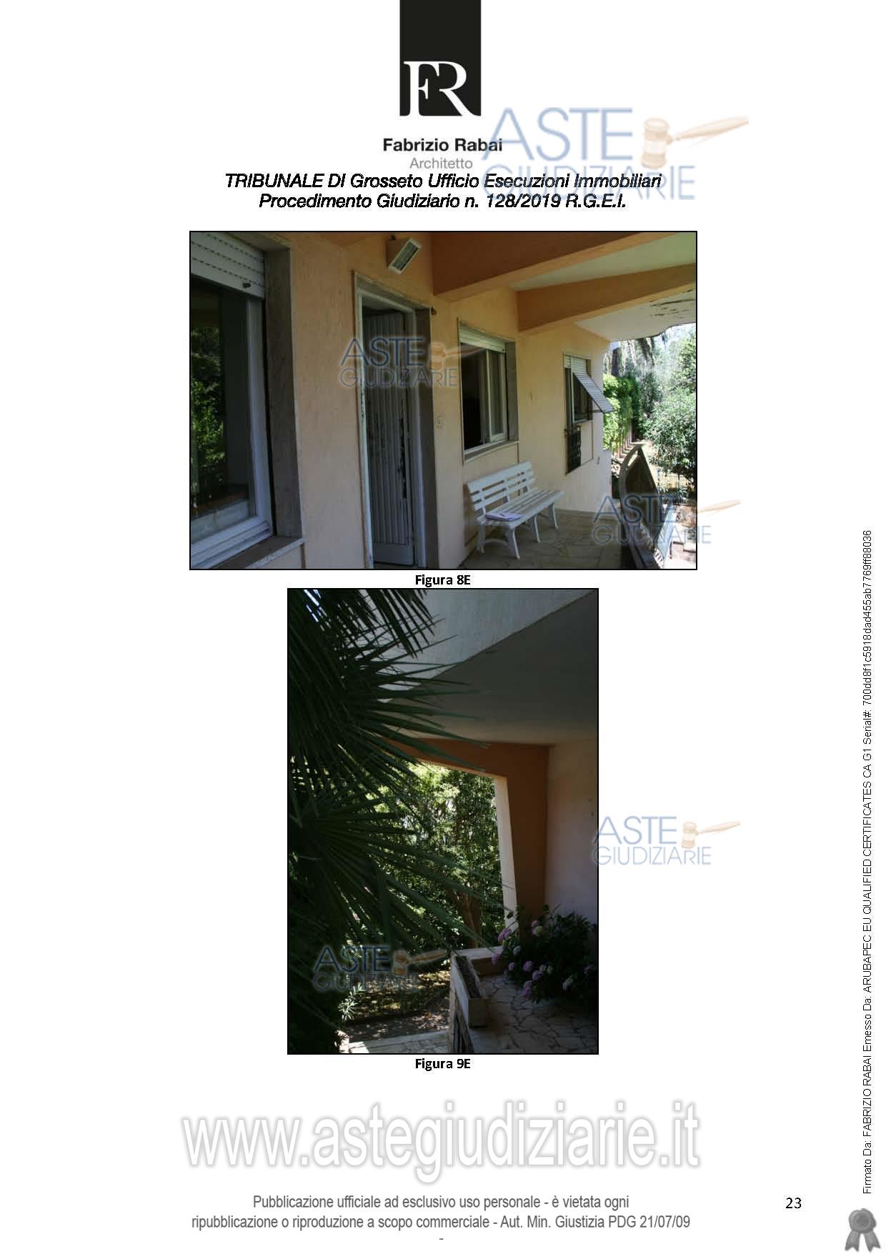 Vendita all'asta Senza incanto, con gara telematica asincrona - LOTTO 1: compendio immobiliare formato da terreni e fabbricati Loc. Pozzarello, Comune di Monte Argentario, Via del Calvello 11, Fg. 17 P.lle 8-9-312. P.lla 8 Villa realizzata su due livelli corredata da ampi spazi esterni, terrazza che si affaccia sul mare e giardini- Cat. A/8 – classe 1– 12,5 vani – Sup. 325 mq ( aree scoperte 314 mq); P.lla 9 Giardino con accesso diretto della villa, in cui si trova il locale tecnico del fabbricato; sup. circa 285mq. P.lla 312 Terreno su cui sorge un car-port circa 25 mq. Prezzo base € 1.540.000,00 (offerta minima € 1.155.000,00). Data inizio operazioni di vendita: 11/11/2025 ore 09:00. Professionista delegato alla vendita Dott. Alessandro Salvini - Email "alessandro.salvini@studioveninata.it"; Tel. 056422425. Custode Giudiziario Dott. Alessandro Salvini - Email "alessandro.salvini@studioveninata.it"; Tel. 056422425. Rif. Tribunale di Grosseto - Esecuzione immobiliare post legge 80 n. 128/2019