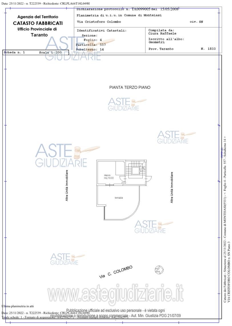 Vendita in attesa dell'emissione del nuovo bando d'asta. LOTTO 7: Appartamento, su fondo enfiteutico, al piano secondo con accesso dalla porta a destra salendo le scale con locale deposito sito al terzo piano con accesso dalla porta a destra salendo le scalee con locale box precisamente il terzo da sinistra di fronte alla saracinesca di ingresso. Ultimo prezzo base € 46.407,00 (offerta minima € 34.806,00). Giudice Dott. Raffaele Viglione. Professionista delegato alla vendita Avv. Rosalba Riccheo - Email "rosalba.riccheo@gmail.com"; Cell. 3495661455. Custode Giudiziario Avv. Edmondo Speciale - Email "avv.speciale@gmail.com"; Tel. 09945333333. Rif. Tribunale di Taranto - Fallimentare (nuovo rito) n. 27/2019