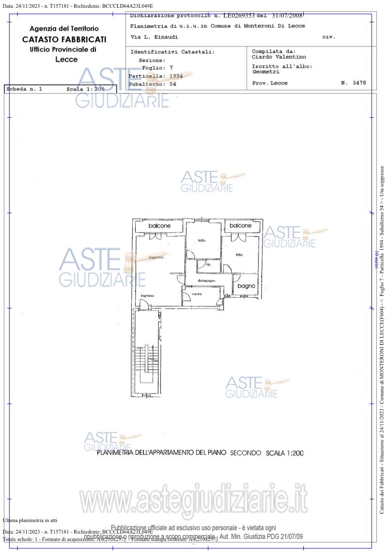 Vendita all'asta Senza incanto, con gara telematica asincrona - LOTTO UNICO: Piena proprietà per la quota di 1000/1000 di un Appartamento sito nel comune di Monteroni di Lecce (Le), in via L. Einaudi n. 32, al piano secondo. L’appartamento è situato al secondo piano di un fabbricato disabitato perché parzialmente allo stato rustico e privo di allacciamenti per la fornitura di servizi cittadini. All’appartamento, privo di porta di ingresso, si accede attraverso scale in cemento armato allo stato rustico e prive di protezione. Prezzo base € 38.481,28 (offerta minima € 28.860,96). Data inizio operazioni di vendita: 19/05/2026 ore 16:15. Professionista delegato alla vendita Dott. Salvatore Martalò - Email "studiomartalo@libero.it"; Tel. 0833609477. Custode Giudiziario Dott. Salvatore Martalò - Email "studiomartalo@libero.it"; Tel. 0833604977. Rif. Tribunale di Lecce - Espropriazione immobiliare (cartabia) n. 311/2023