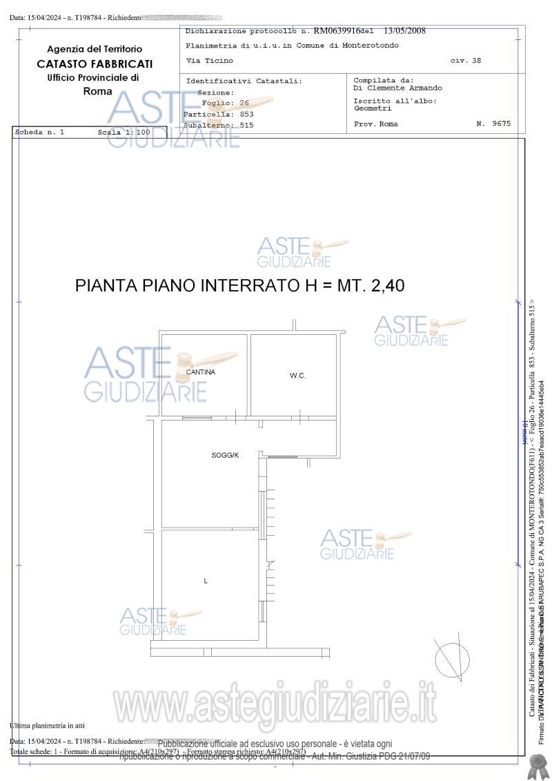 Vendita all'asta Senza incanto, con gara telematica asincrona - LOTTO UNICO: Quota pari a 1/1 del diritto di proprietà.Immobile residenziale ubicato nel Comune di Monterotondo (RM), via Ticino n. 40, piano S1. Distinto catastalmente al foglio 26, part. 853, sub 515, cat. A/2, classe 3, consistenza 3,5 vani, rendita € 533,24. Composto da salone con angolo cottura, camera e bagno per una superficie complessiva di 54mq. Prezzo base € 52.500,00 (offerta minima € 39.375,00). Data inizio operazioni di vendita: 22/12/2025 ore 12:00. Giudice Dott. Francesco Lupia. Professionista delegato alla vendita Avv. Carlo Rainaldi - Email "carlo.rainaldi@hotmail.it"; Cell. 3405705302. Custode Giudiziario Dott. Ivg Di Roma S.R.L. - Email "pvp@visiteivgroma.it"; Tel. 0689569801. Rif. Tribunale di Tivoli - Espropriazione immobiliare (cartabia) n. 411/2023