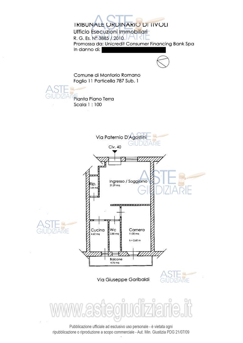 Vendita all'asta Senza incanto, con gara telematica asincrona - LOTTO UNICO: Piena proprietà del compendio immobiliare, sito nel Comune di Montorio Romano(RM) Via Partenio D’Agostini n.40 e precisamente: Appartamento posto al piano terra costituito da ingresso-soggiorno, ripostiglio, cucina, bagno, camera, balcone. La superficie lorda è di mq 50,76 circa. L’immobile è distinto al NCEU del comune di Montorio Romano (RM )al foglio 11 particella 787 sub. 1. Prezzo base € 11.390,62 (offerta minima € 8.542,96). Data inizio operazioni di vendita: 31/03/2026 ore 15:00. Professionista delegato alla vendita Avv. Roberto Napoleoni - Email "studioavvnapoleoni@gmail.com"; Cell. 0774317010. Custode Giudiziario Ivg Di Roma Srl - Email "pvp@visiteivgroma.it"; Tel. 0689569801. Rif. Tribunale di Tivoli - Esecuzione immobiliare post legge 80 n. 3885/2010