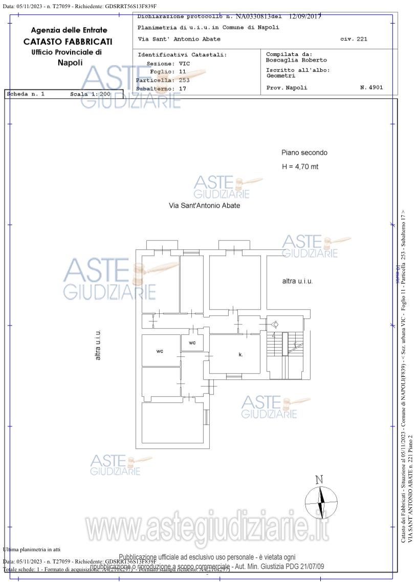 Vendita in attesa dell'emissione del nuovo bando d'asta. LOTTO UNICO: Il cespite oggetto della presente procedura immobiliare di pignoramento è ubicato nel quartiere Vicaria. L’immobile è rappresentato da un’abitazione di tipo popolare costituita da 4 camere, 2 cucine e due bagni e prospetta su via Sant’Antonio Abate con due balconi. Ultimo prezzo base € 189.000,00 (offerta minima € 141.750,00). Professionista delegato alla vendita Avv. Francesco Marino - Email "avvfrancescomarinoa@gmail.com"; Cell. 330868633; Tel. 089253007. Custode Giudiziario Avv. Francesco Marino - Email "avvfrancescomarinoa@gmail.com"; Cell. 330868633; Tel. 089253007. Rif. Tribunale di Napoli - Espropriazione immobiliare (cartabia) n. 239/2023