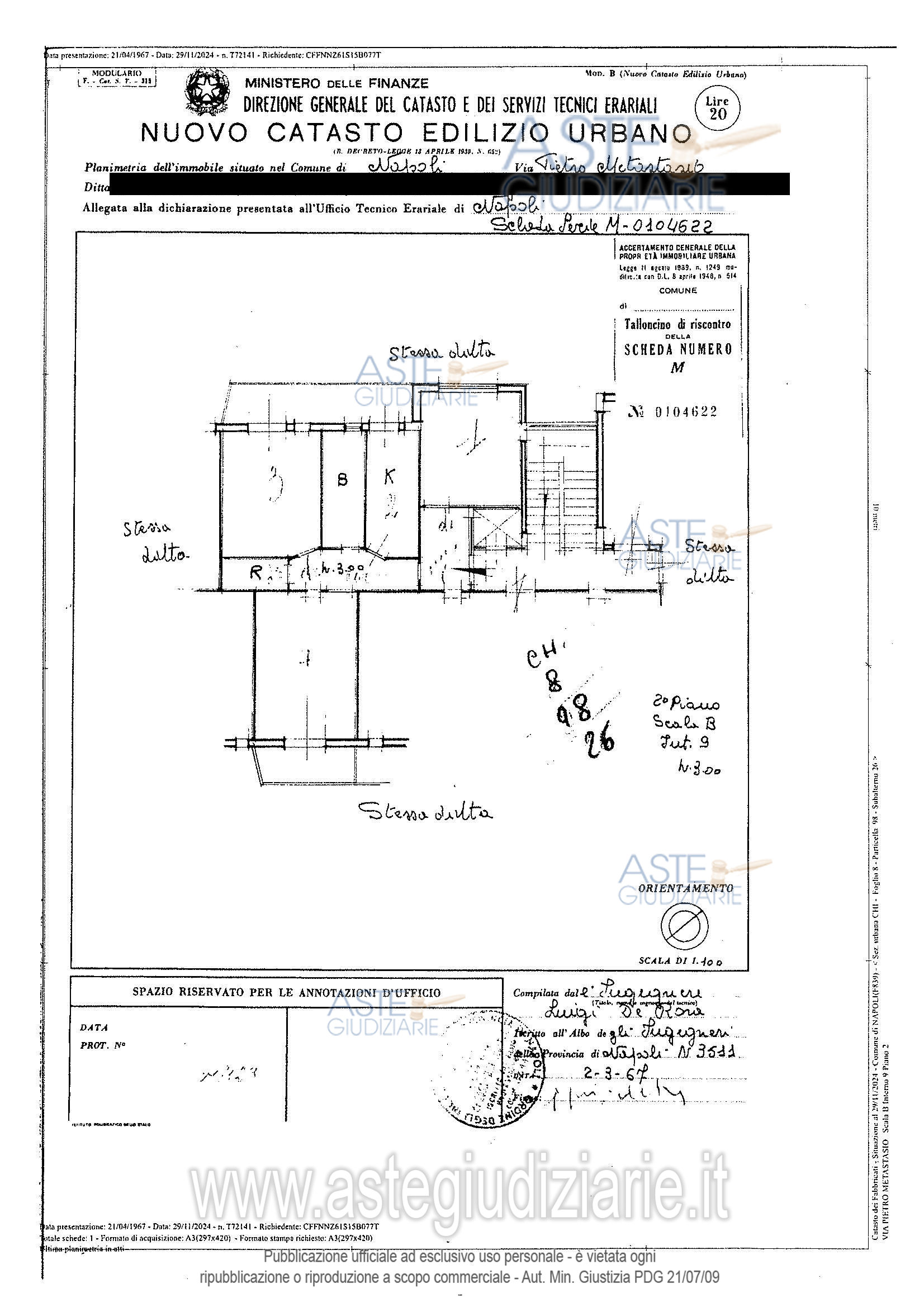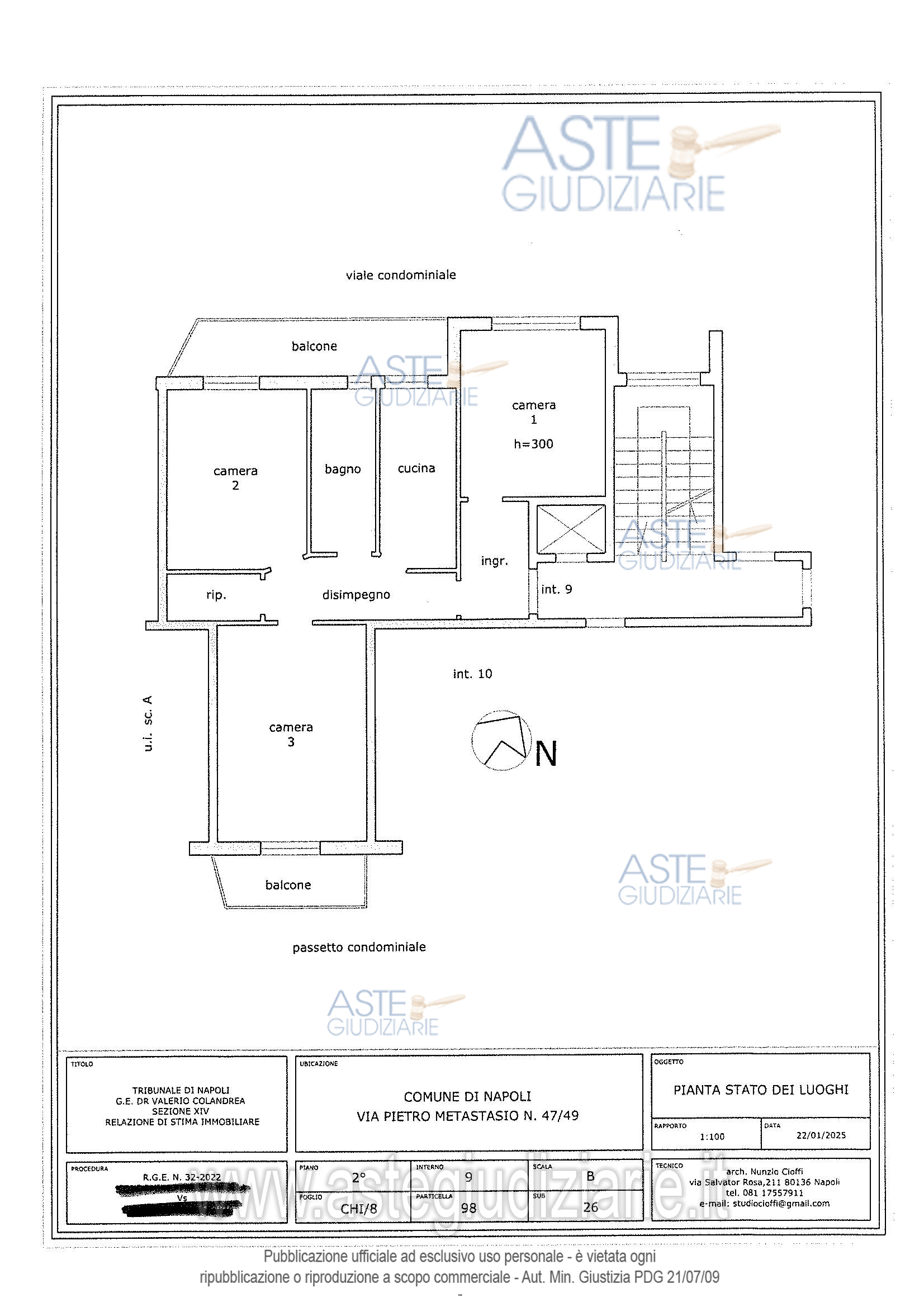 Vendita all'asta Senza incanto, con gara telematica asincrona - LOTTO UNICO: Piena ed intera proprietà dell’unità immobiliare destinata a civile abitazione, sita in Napoli, alla via Pietro Metastasio n. 47/49, scala B, piano secondo, interno 9, composta da ingresso, disimpegno, cucina, tre camere, bagno, ripostiglio e due balconi, identificata nel Catasto Fabbricati del Comune di Napoli alla Sezione CHI, foglio 8, particella 98, sub 26, cat. A/2, cl. 6, vani 5,5, superficie 87 mq, rendita catastale euro 795,34, indirizzo catastale Via Pietro Metastasio Scala B interno 9 piano 2. Prezzo base € 167.250,00 (offerta minima € 125.437,50). Data inizio operazioni di vendita: 09/06/2026 ore 13:00. Giudice Miriam Valenti. Professionista delegato alla vendita Avv. Giuseppe Ciuoffo - Email "g.ciuoffo@studiolegaleciuoffo.it". Custode Giudiziario Avv. Giuseppe Ciuoffo - Email "g.ciuoffo@studiolegaleciuoffo.it". Rif. Tribunale di Napoli - Esecuzione immobiliare post legge 80 n. 32/2022