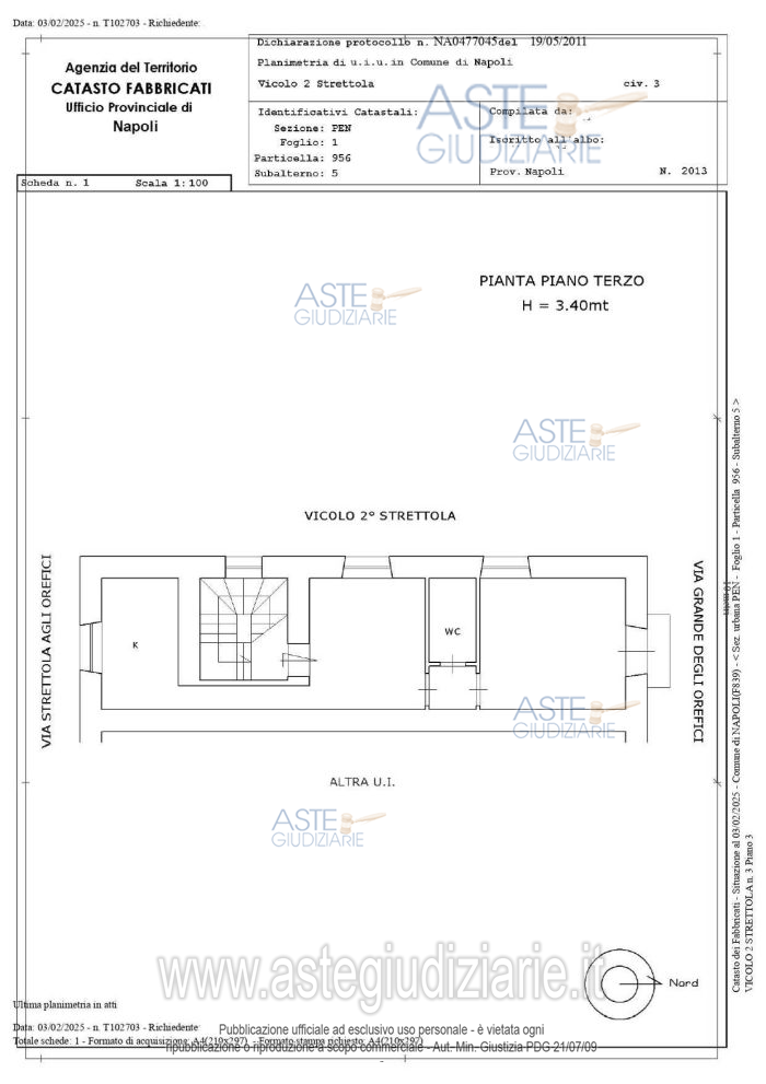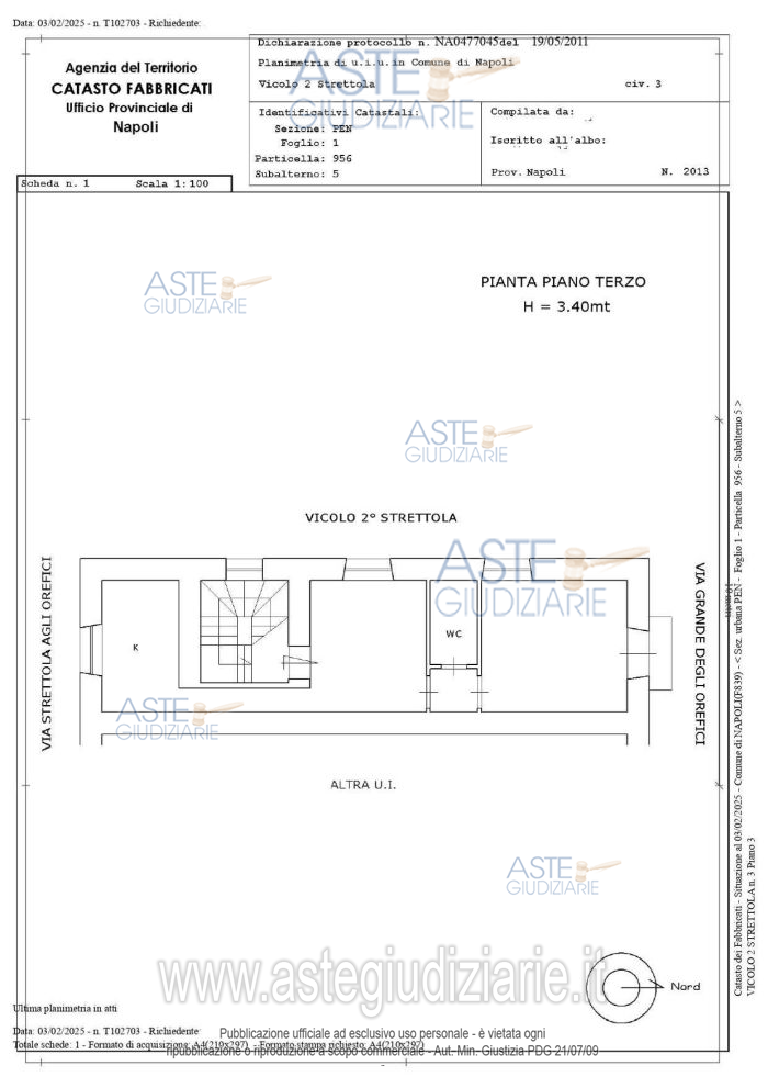 Vendita in attesa dell'emissione del nuovo bando d'asta. LOTTO UNICO: In Napoli Vico II Strettola agli Orefici n. 3- piena proprietà dell’appartamento al terzo piano composto da ingresso in zona pranzo/cucina, due camere, un bagno, corridoio e disimpegno. Ultimo prezzo base € 118.000,00 (offerta minima € 88.500,00). Professionista delegato alla vendita Avv. Daniela Nappi - Email "avv.danielanappi@gmail.com"; Tel. 0815586421. Custode Giudiziario Avv. Daniela Nappi - Email "avv.danielanappi@gmail.com"; Tel. 0815586421. Rif. Tribunale di Napoli - Espropriazione immobiliare (cartabia) n. 11/2025