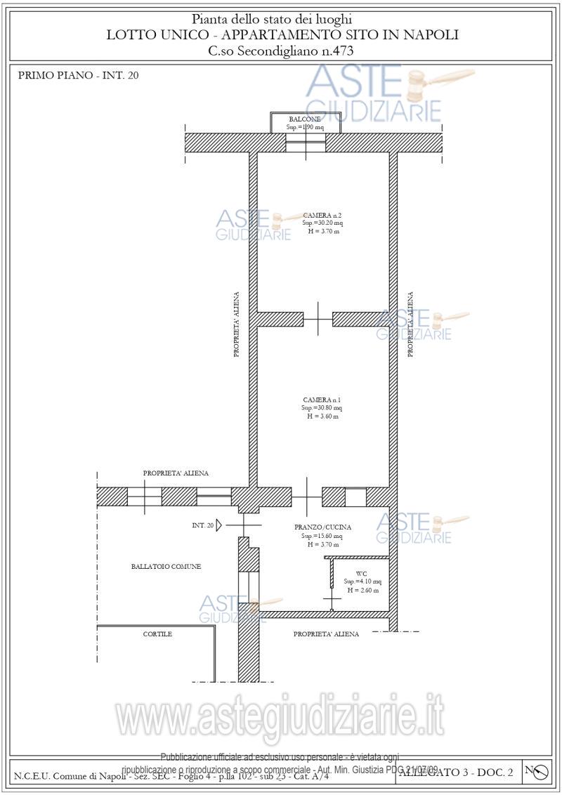 Vendita all'asta Senza incanto, con gara telematica asincrona - LOTTO UNICO: Piena ed intera proprietà di immobile sito in Napoli C.so Umberto I n. 473, piano 1, int. 20 (Indirizzo catastale).Si rappresenta che l’indirizzo che identifica l'immobile è c.so Secondigliano, in luogo dell’indirizzo catastale c.so Umberto I indicato in visura catastale. Il cambio di toponomastica, non inficia la corretta individuazione dell'immobile. Il compendio pignorato è ubicato in un contesto prevalentemente di tipo popolare. Prezzo base € 70.000,00 (offerta minima € 52.500,00). Data inizio operazioni di vendita: 14/04/2026 ore 15:30. Professionista delegato alla vendita Avv. Alberto Borzillo - Email "studiolegaleborzillo@gmail.com"; Cell. 3491749819; Tel. 0823752989. Custode Giudiziario Avv. Alberto Borzillo - Email "studiolegaleborzillo@gmail.com"; Cell. 3491749819; Tel. 0823752989. Rif. Tribunale di Napoli - Espropriazione immobiliare (cartabia) n. 565/2024