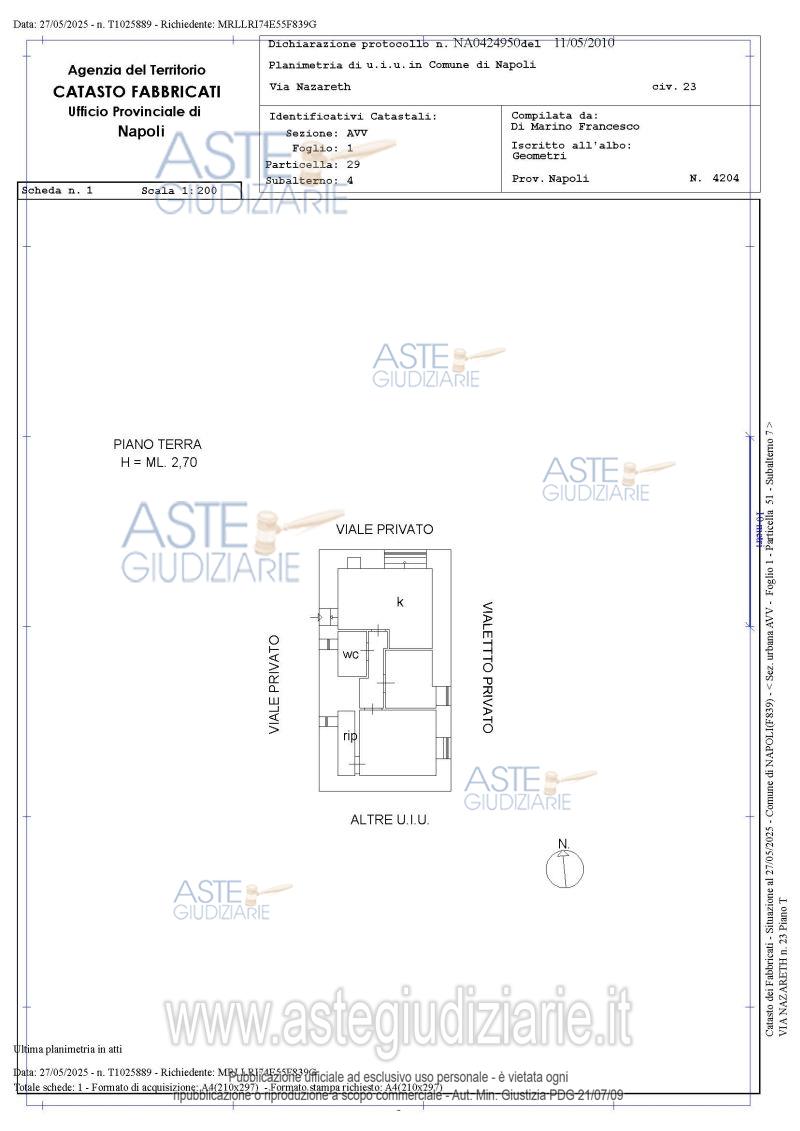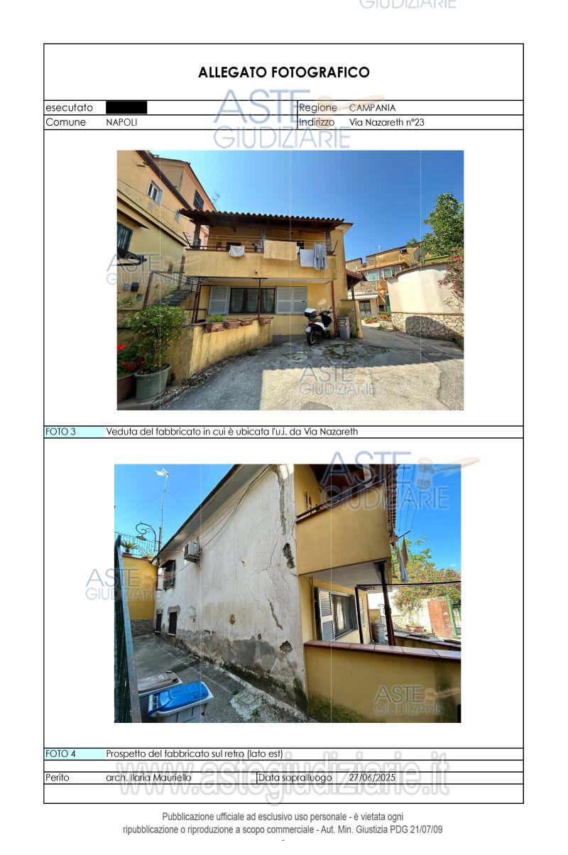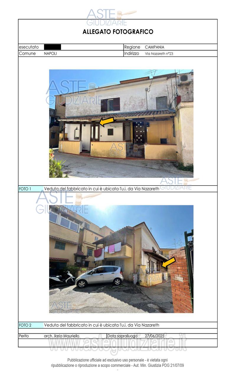 Vendita all'asta Senza incanto, con gara telematica asincrona - LOTTO UNICO: Piena ed intera proprietà dell’unità immobiliare posta al piano terra di un piccolo fabbricato sito in Napoli alla Via Nazareth n°23, già Cupa Nazareth n°23. L’accesso è indipendente ed avviene direttamente dalla strada, dopo aver attraversato un piccolo terrazzino. Il cespite è composto da: cucina-soggiorno, n°2 camere, bagno, disimpegno e ripostiglio, nonché piccola area esterna; il tutto per una superficie netta complessiva pari a mq 49 ed una superficie commerciale pari a complessivi mq. 64. Prezzo base € 66.000,00 (offerta minima € 49.500,00). Data inizio operazioni di vendita: 16/06/2026 ore 16:30. Professionista delegato alla vendita Avv. Benvenuto Di Flumeri - Email "avvocatidiflumeri@gmail.com"; Tel. 0819762679. Custode Giudiziario Avv. Benvenuto Di Flumeri - Email "avvocatidiflumeri@gmail.com"; Tel. 0819762679. Rif. Tribunale di Napoli - Espropriazione immobiliare (cartabia) n. 180/2025