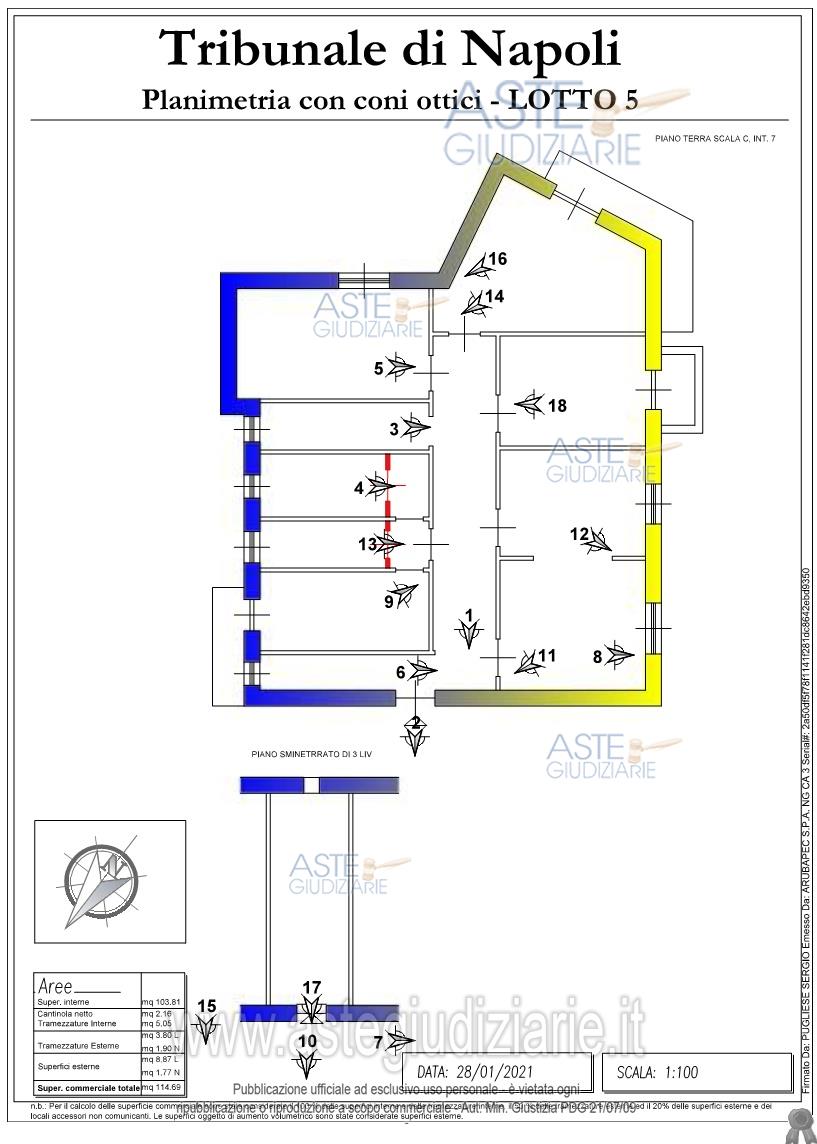 Vendita all'asta Senza incanto, con gara telematica asincrona - LOTTO 5: L’appartamento con annessa cantina è ubicato al piano T-S3, scala C, int 7 e misura una superficie di circa 104 mq l'appartamento e circa 5 mq la cantinola. L'appartamento è composto da salone diviso in due stanze, tre camere da letto, una cucina, due bagni, un corridoio, un ripostiglio, due disimpegni e l'ingresso. Attualmente, sono in corso operazioni di rilascio dell'immobile. Prezzo base € 365.000,00 (offerta minima € 273.750,00). Data inizio operazioni di vendita: 23/06/2026 ore 10:00. Professionista delegato alla vendita: Dott. Fabrizio Baraini - Email "fb@primeconsultingsrl.com"; Tel. 081/19810354.