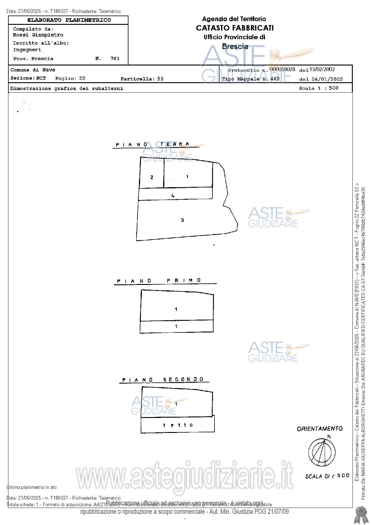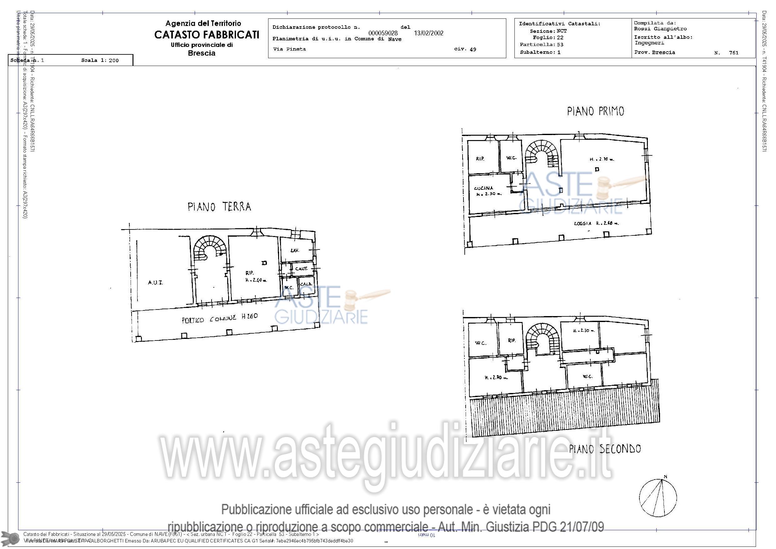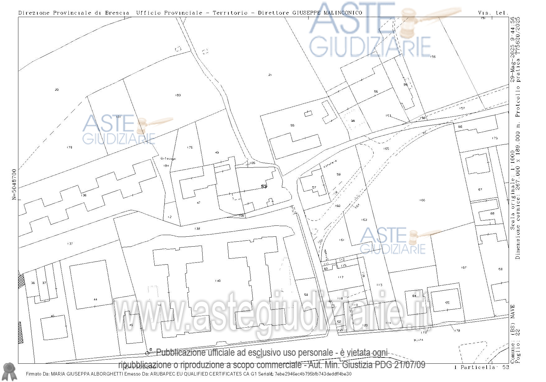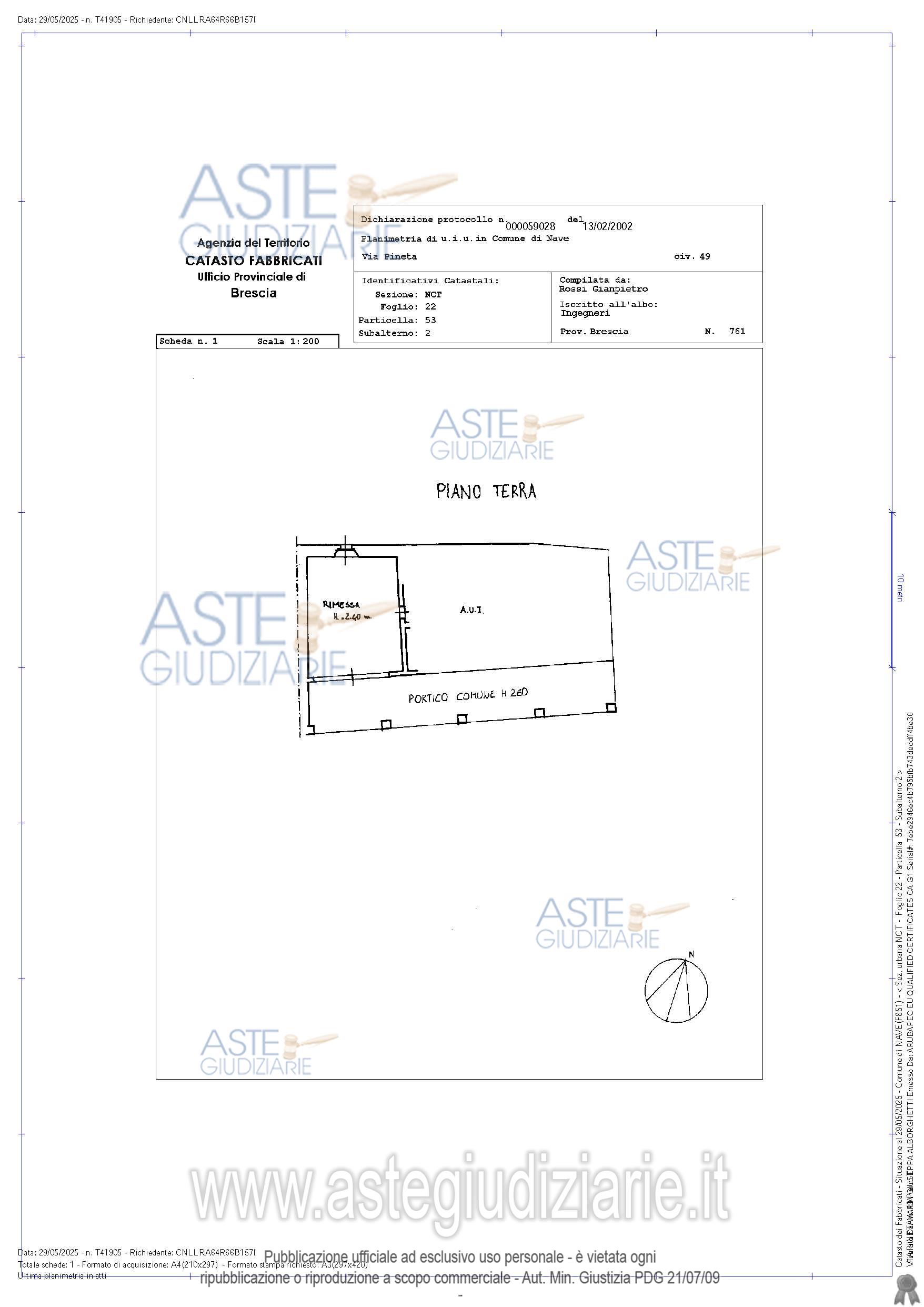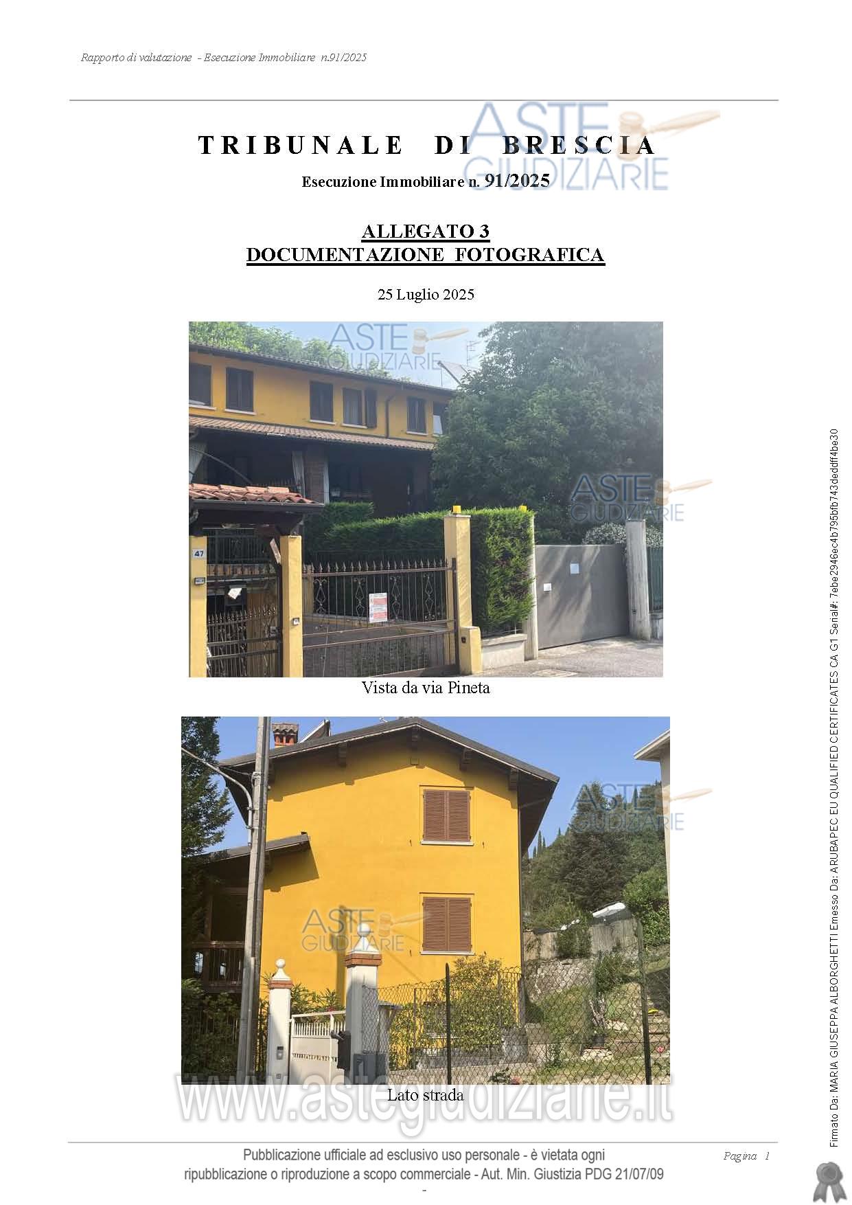 Vendita all'asta Senza incanto, con gara telematica asincrona - LOTTO UNICO: Edificio unifamiliare su due piani fuori terra con autorimessa, portici e area esclusiva il tutto censito al Catasto Fabbricati di detto Comune, Sez. NCT Fg. 22 mapp. 53 sub 1 – P. T-1-2 - cat. A/2 - cl. 5 – 11,5 vani - R.C. Euro 653,32 mapp. 53 sub 2 – P. T - cat. C/6 - cl. 2 – 43 mq - R.C. Euro 66,62 Oltre alle proporzionali quote sulle parti comuni dell’edificio. Prezzo base € 518.625,00 (offerta minima € 388.968,75). Data inizio operazioni di vendita: 31/03/2026 ore 12:00. Giudice Dellesecuzione Giudice. Professionista delegato alla vendita Not. Elena Cairoli - Email "ecairoli@notariato.it". Custode Giudiziario Not. Elena Cairoli - Email "info.bsimmobiliare@gmail.com". Rif. Tribunale di Brescia - Espropriazione immobiliare (cartabia) n. 91/2025