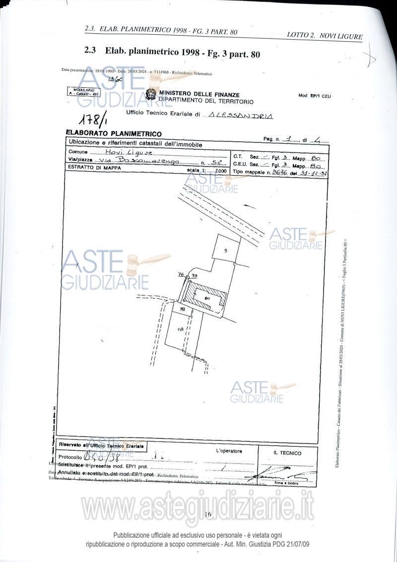 Vendita all'asta Senza incanto - LOTTO 2: Complesso rurale in precario stato conservativo;più volumi racchiusi entro corte.Nord:casa su tre piani,portico crollato;est,casa con portico in parte crollato;sud,porticato da demolire;ovest:portico.Servitù passaggio pedonale e carraio passiva.Irregolarità:un fabbricato non riportato in planimetria accatastamento;da demolire.Portico:nuovo solaio,sopraelevazione muraria,rifacimento tetto,apertura finestre;da demolire volume eccedente stato di fatto.E' di interesse storico artistico quale Cascina fortificata. Prezzo base € 30.586,50 (offerta minima € 22.940,00). Data vendita 28/04/2026 ore 09:30. Giudice Elisabetta Bianco. Professionista delegato alla vendita Avv. Francesco Mercuri - Email "AVV.FMERCURI@GMAIL.COM"; Cell. 3480322585; Tel. 01311852246. Custode Giudiziario Avv. Francesco Mercuri - Email "AVV.FMERCURI@GMAIL.COM"; Cell. 3480322585; Tel. 01311852246. Rif. Tribunale di Alessandria - Esecuzione immobiliare post legge 80 n. 355/2017