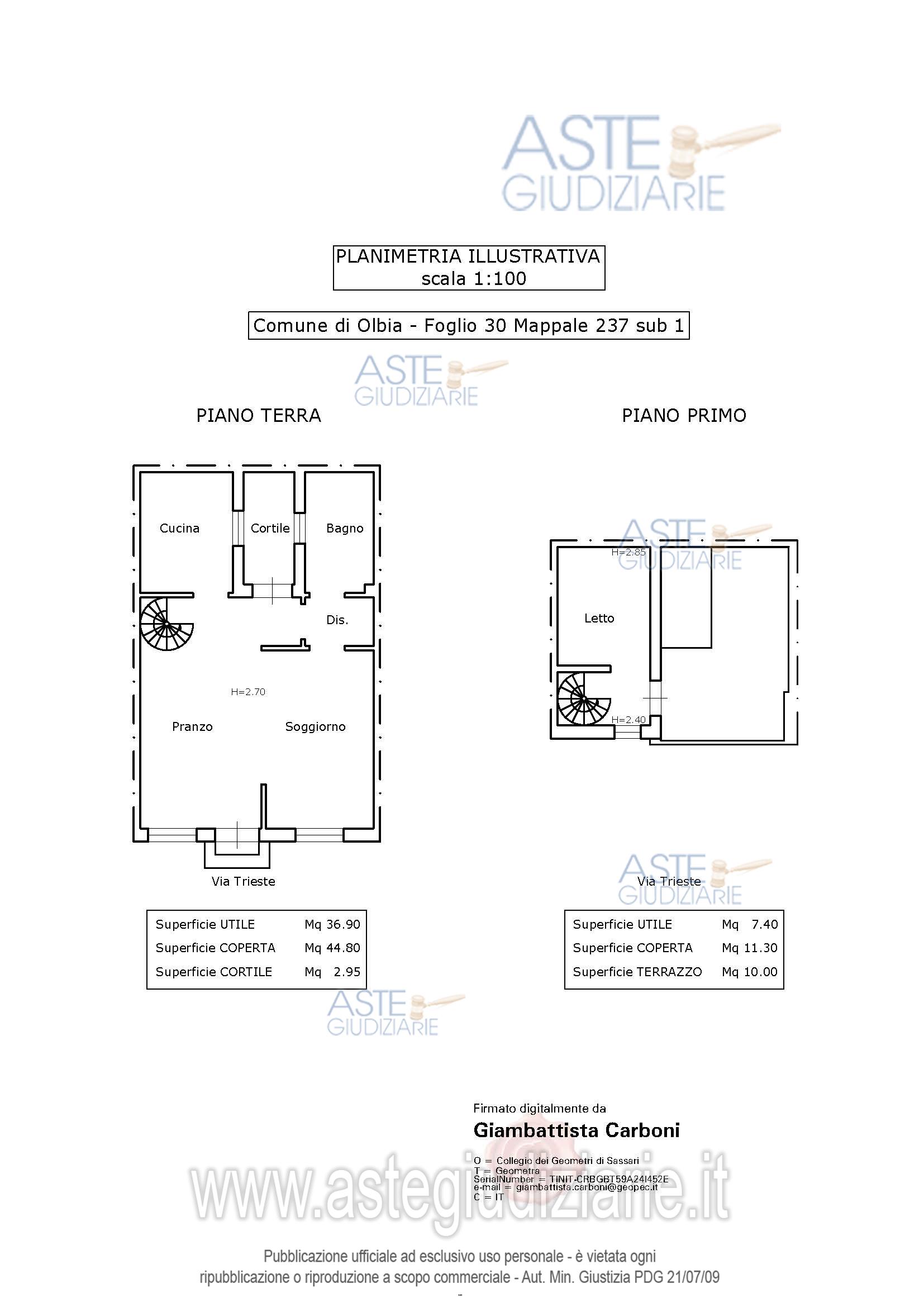 Vendita all'asta Senza incanto - LOTTO UNICO: quota pari ad 1/5 di appartamento a due piani fuori terra sito in Comune di Olbia, in Via Trieste n.13, distinto al N.C.E.U. al foglio 30 mappale 237 sub.1, articolato con un piano terra composto da 2 vani ed accessori della superficie lorda di mq. 44,80 ed utile di mq. 36,90, ed un piano primo composto da un unico vano della superficie lorda di mq. 11,30 ed una superficie utile di mq. 7,40, con annessi piccolo cortile al piano terra e terrazzo al piano primo. Prezzo base € 13.837,50 (offerta minima € 10.379,00). Data vendita 30/04/2026 ore 16:30. Giudice Alessandro Di Giacomo. Curatore Dott. Paolo Sotgiu - Email "paolo.sotgiu@studiosotgiu.com"; Tel. 0792151063. Rif. Tribunale di Tempio Pausania - Fallimentare (nuovo rito) n. 11/2023