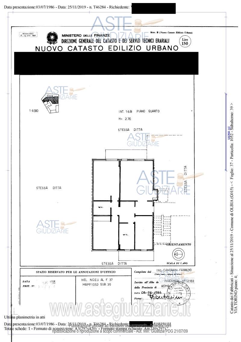 In Catasto Fabbricati Olbia f. 37, part. 1052, sub. 39, z. cens. 1, cat. A/2, Cl. 1, vani 5,5, sup. cat. 100 mq- totale escl. aree scoperte 96 mq, r.c. Euro 795,34, Via Torino piano 4.