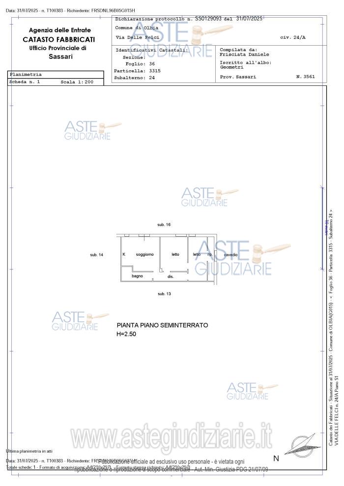 Vendita all'asta Senza incanto, con gara telematica asincrona - LOTTO UNICO: Intera proprietà dell’appartamento sito nel comune di Olbia, via delle felci 34/a, pianoseminterrato, composto da 3 camere, 1 bagno ed un locale accessorio, 68,16 mq totali disuperficie, distinto all’NCEU del Comune di Olbia al Foglio 36 mappale 3315 sub. 24, conannesse corti e verande coperte e scoperte di pertinenza. Tutti gli ambienti risultano essere stati oggetto di una ristrutturazione iniziata e non completata. Prezzo base € 60.850,00 (offerta minima € 45.638,00). Data inizio operazioni di vendita: 25/02/2026 ore 15:00. Giudice Dott. Alessandro Di Giacomo. Professionista delegato alla vendita Avv. Angelo Antonio Secchi - Email "AVVANGELOSECCHI@GMAIL.COM"; Cell. 3200686471; Tel. 3200686471. Custode Giudiziario Istituto Vendite Giudiziarie - Email "visite.ivgtempio@gmail.com"; Cell. 388829746; Tel. 079630505. Rif. Tribunale di Tempio Pausania - Espropriazione immobiliare (cartabia) n. 15/2024