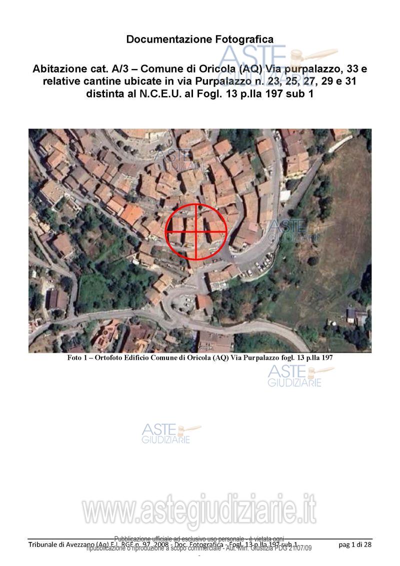 Vendita all'asta Senza incanto, con gara telematica asincrona - LOTTO 1: Appartamento ubicato in Oricola (AQ), Via Purpalazzo n.33, piano terra, consistenza 9,5 vani facente parte di un fabbricato di pregio storico risalente alla seconda metà del XVI secolo composto di due piani fuori terra a destinazione residenziale e due piani seminterrati con fondaci, magazzino e garage. Prezzo base € 81.174,74 (offerta minima € 60.881,05). Data inizio operazioni di vendita: 28/01/2026 ore 15:00. Professionista delegato alla vendita Avv. Roberto Walter Berardini - Email "roberto.berardini@virgilio.it"; Cell. 3490608911; Tel. 0863444247. Custode Giudiziario Avv. Roberto Walter Berardini - Email "roberto.berardini@virgilio.it"; Cell. 3490608911; Tel. 0863444247. Rif. Tribunale di Avezzano - Esecuzione immobiliare post legge 80 n. 97/2008