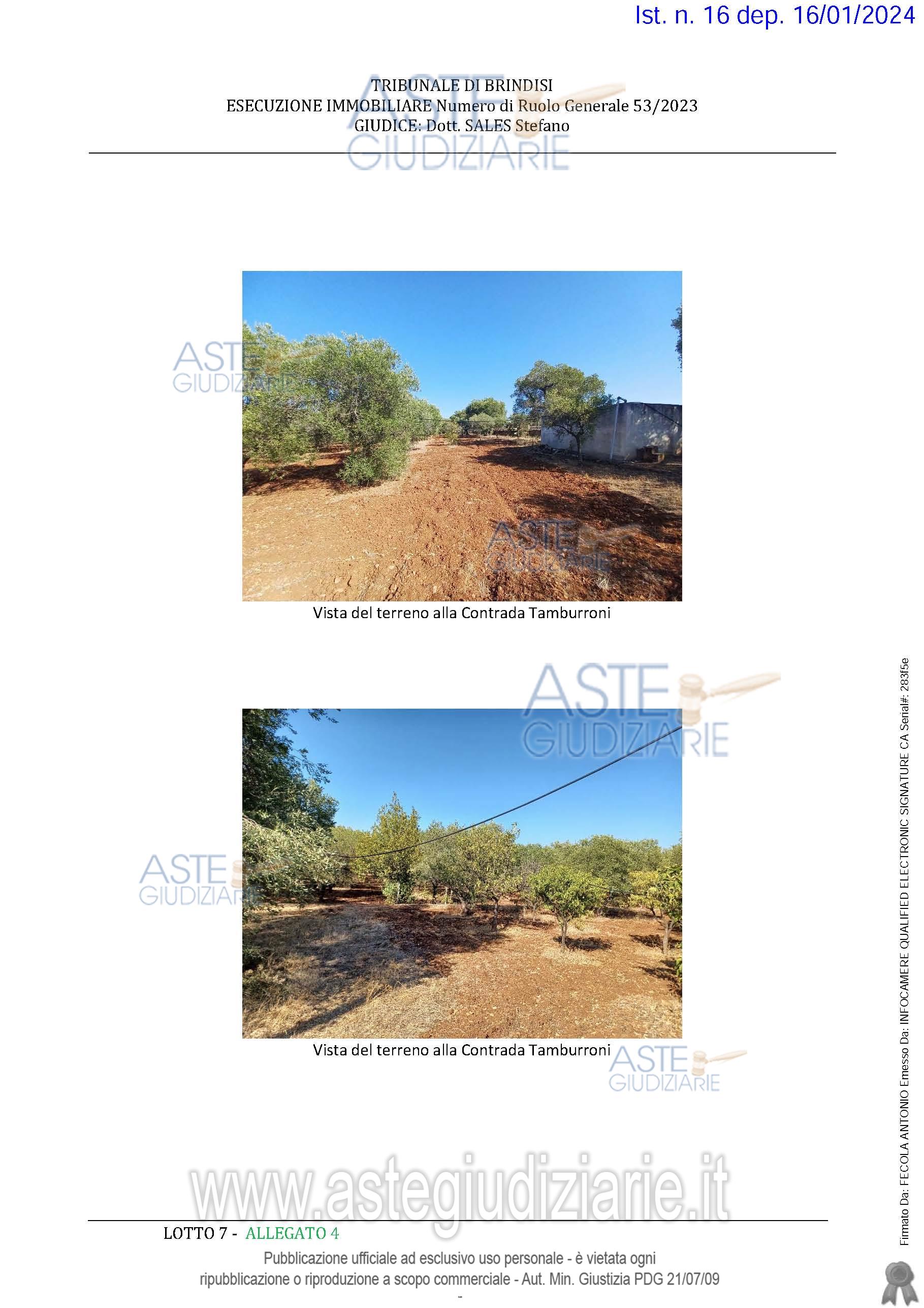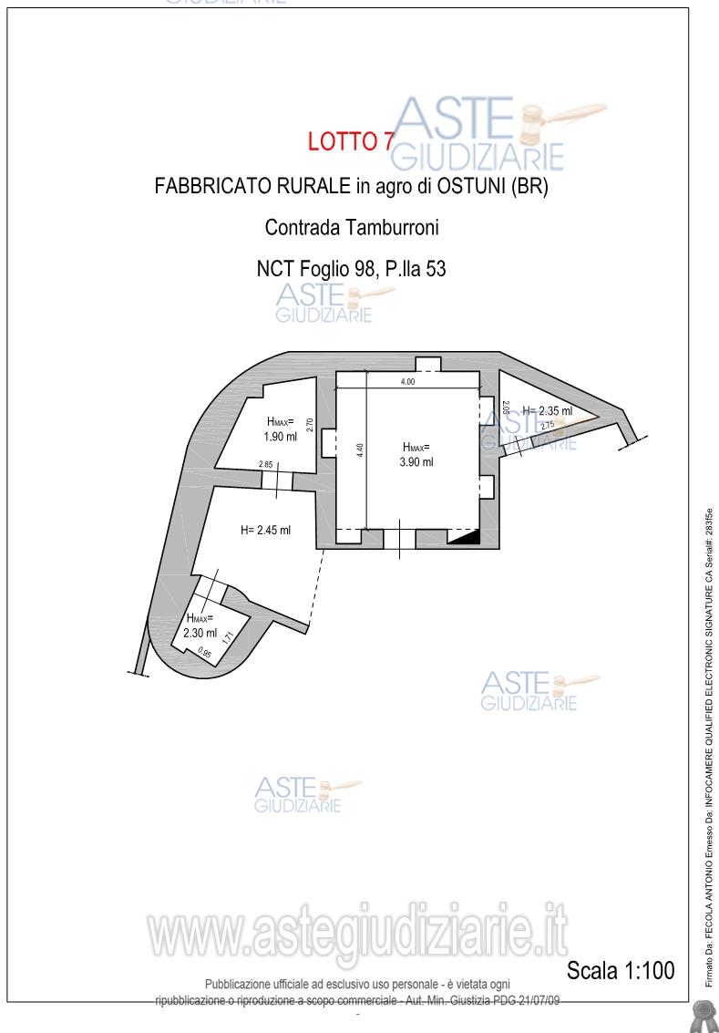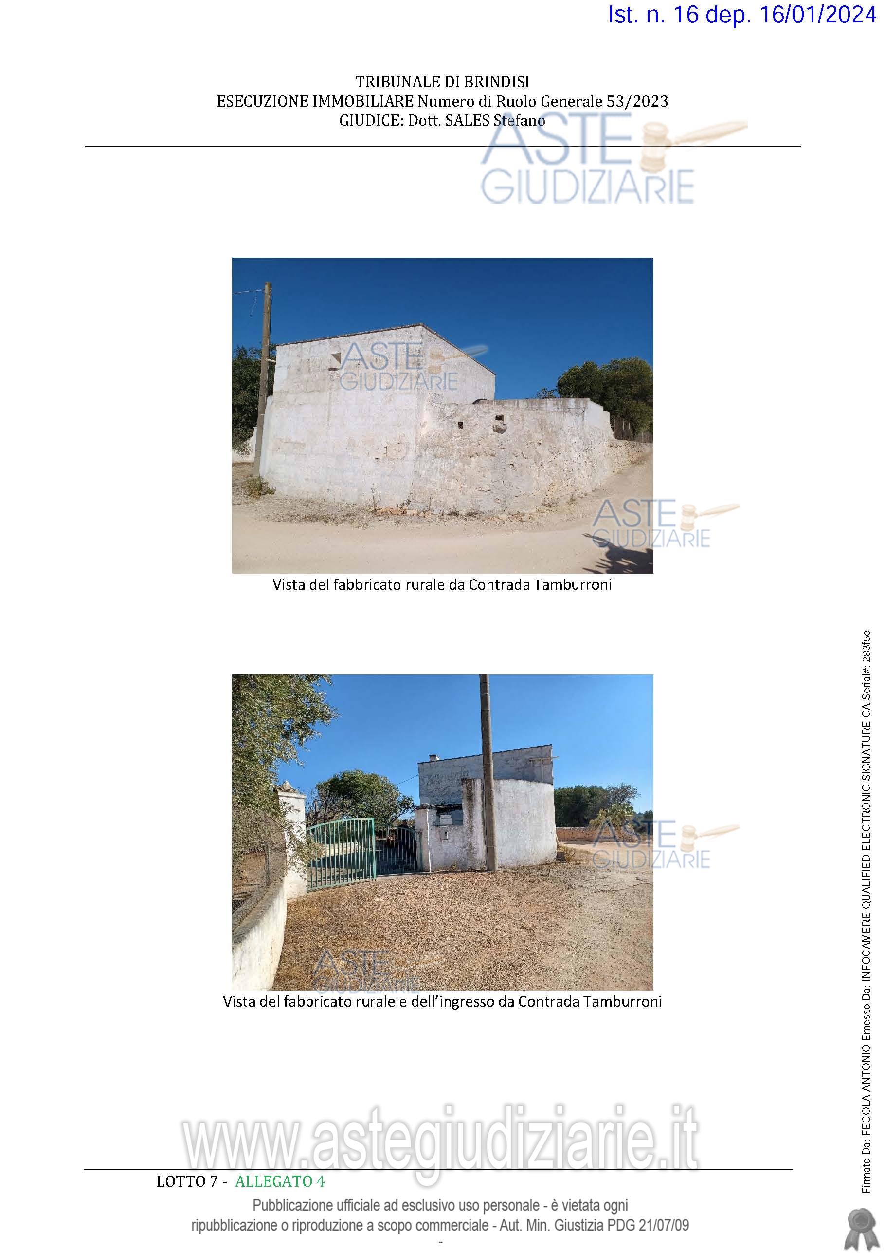 Vendita all'asta Senza incanto, con gara telematica asincrona - LOTTO 7: Fabbricato rurale della superficie commerciale di 55,00 mq per la quota di 1/1 di piena proprietà - L'unità immobiliare oggetto di valutazione è posta al piano Terra, ha un'altezza interna di varia. Prezzo base € 20.000,00 (offerta minima € 15.000,00). Data inizio operazioni di vendita: 06/05/2026 ore 11:00. Giudice Francesco Giliberti. Professionista delegato alla vendita Avv. Luigi De Franco - Email "defrancoleg@gmail.com". Custode Giudiziario Avv. Luigi De Franco - Email "defrancoleg@gmail.com"; Tel. 0831364724. Rif. Tribunale di Brindisi - Esecuzione immobiliare post legge 80 n. 53/2023