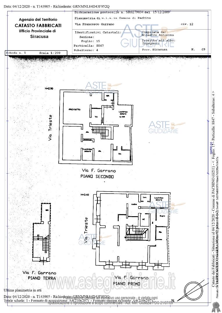 Vendita in attesa dell'emissione del nuovo bando d'asta. LOTTO 4: piena proprietà di appartamento sito in Pachino (SR), Via Garrano n. 12, che si sviluppa fra il primo ed il secondo livello di un organismo edilizio sito tra la Via Garrano e la Via Trieste (in N.C.E.U. del Comune di Pachino al foglio 15, p.lla 8847, sub. 4, vani 11,5, cat. A/2, cl. 2). Ultimo prezzo base € 88.910,16 (offerta minima € 66.682,62). Giudice Alessia Romeo. Professionista delegato alla vendita Avv. Gabriele Galota - Email "galota.gabriele@gmail.com"; Tel. 09311562510. Custode Giudiziario Avv. Gabriele Galota - Email "galota.gabriele@gmail.com"; Tel. 09311562510. Rif. Tribunale di Siracusa - Esecuzione immobiliare post legge 80 n. 156/2020