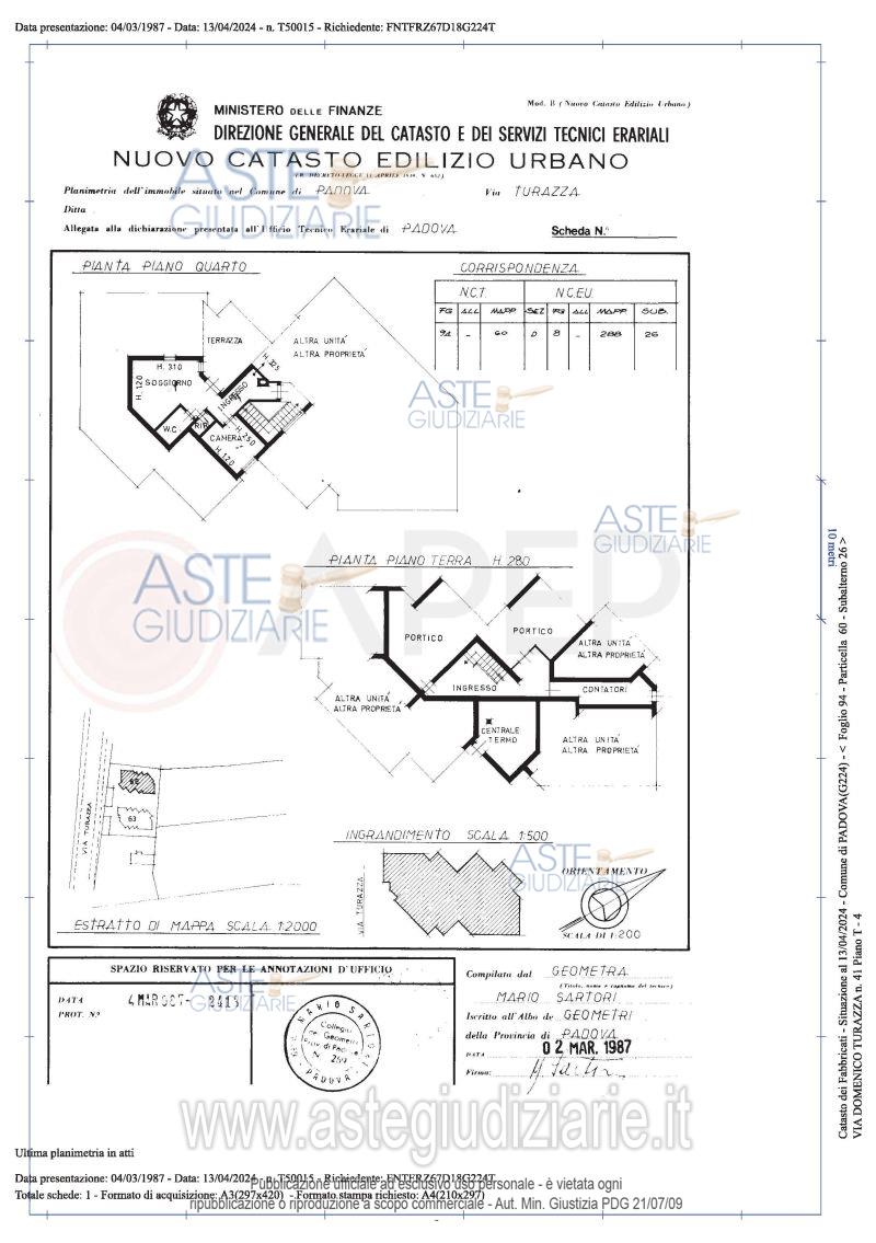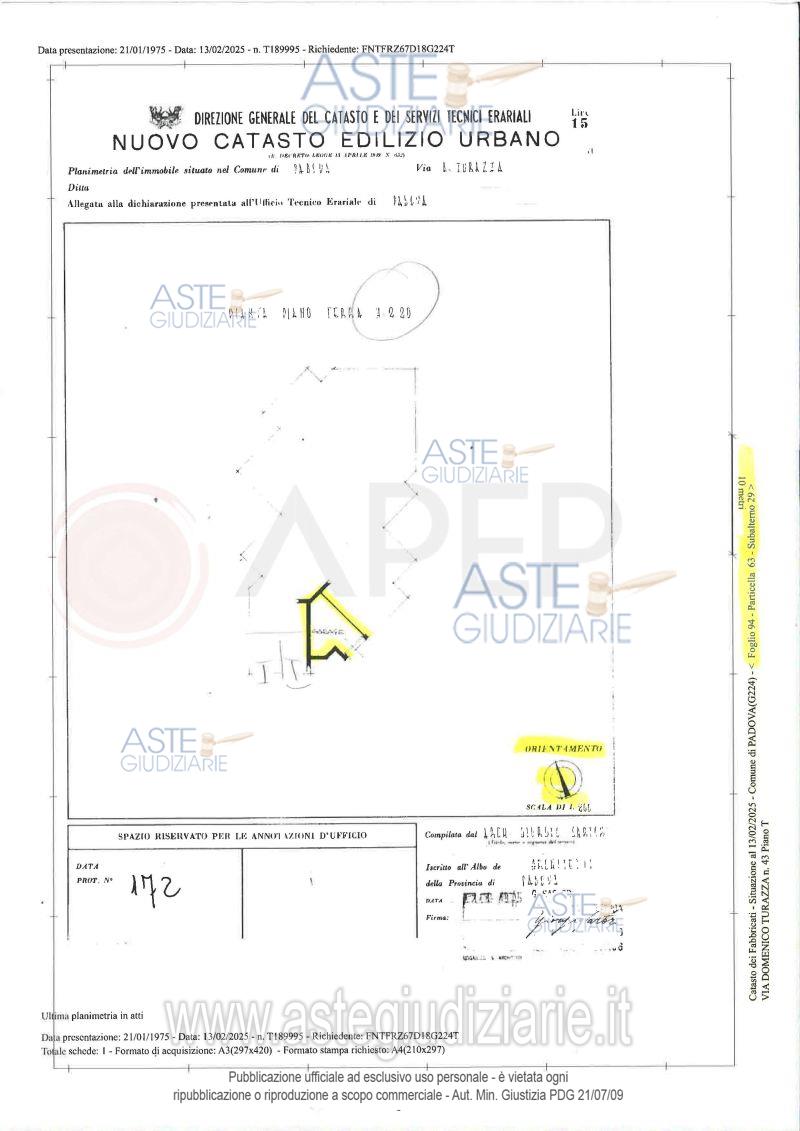 Vendita all'asta Senza incanto, con gara telematica sincrona - LOTTO UNICO: Lotto Unico - piena proprietà di unità immobiliari facenti parte del complesso condominiale formato da due edifici, denominati "Condominio Castore", per l'appartamento e "Condominio Polluce", per il garage, sito in Comune di Padova, località Stanga, quartiere Forcellini-Camin, via Domenico Turazza con ingresso, rispettivamente, da civici 41 e 43 e precisamente: mini appartamento da ristrutturare al piano quarto con terrazza e garage al piano terra della superficie commerciale complessiva di mq. 69. Libero. Prezzo base € 35.000,00 (offerta minima € 26.250,00). Data vendita 21/10/2025 ore 10:00. Giudice Amenduni. Professionista delegato alla vendita Not. Lorenzo Todeschini Premuda - Email "aste@apepnotai.it"; Tel. 049651228. Custode Giudiziario Ass. Prof. Apep - Email "visita@apepnotai.it"; Tel. 049651228. Rif. Tribunale di Padova - Espropriazione immobiliare (cartabia) n. 39/2024