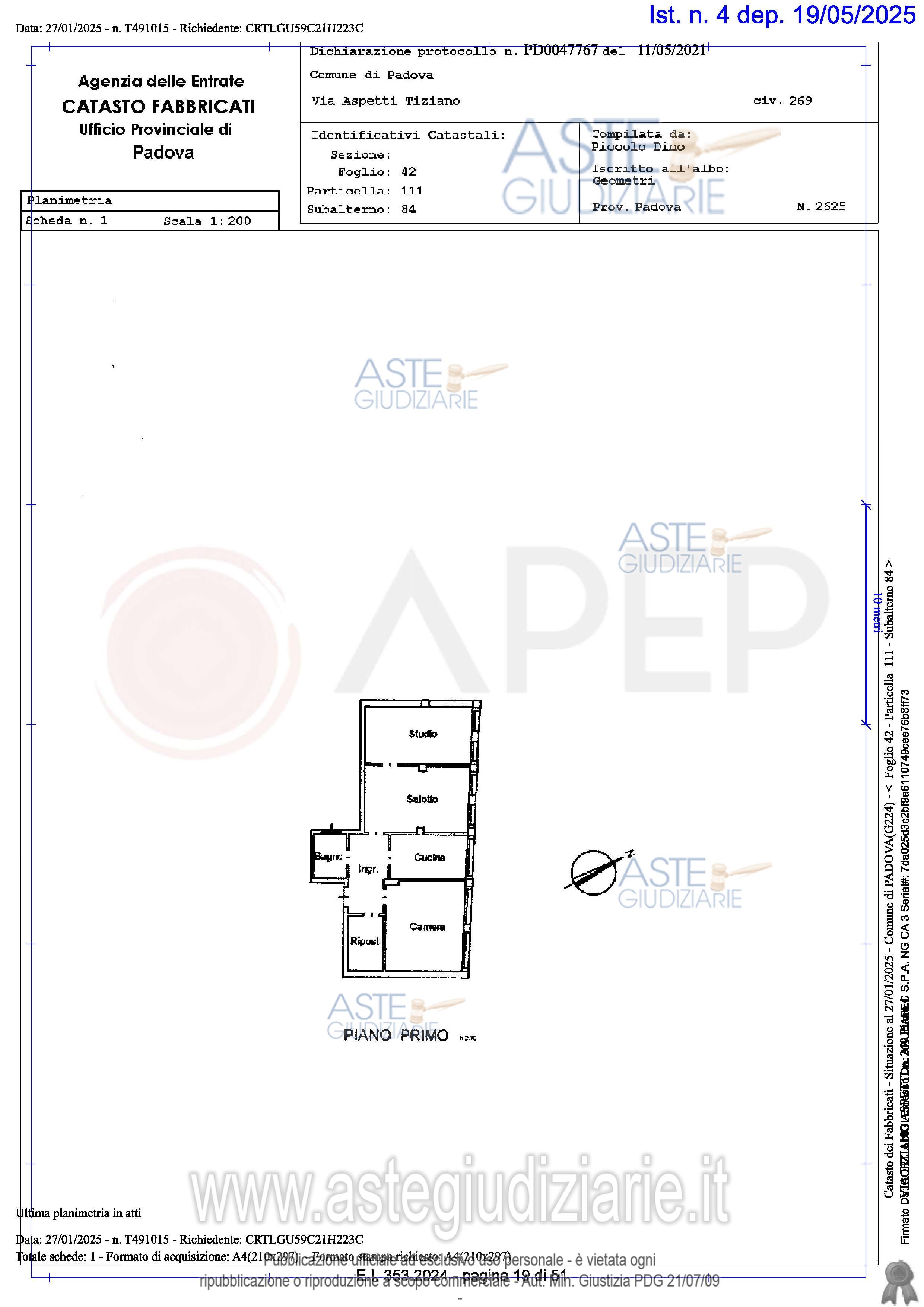 Vendita all'asta Senza incanto, con gara telematica sincrona - LOTTO UNICO: Lotto Unico - piena proprietà di unità immobiliare facente parte del fabbricato condominiale sito in Comune di Padova, via Tiziano Aspetti n. 269 Scala B int. 2 e precisamente appartamento al piano primo, prospetto sul lato nord, composto da ingresso, studio, salotto, cucina, camera, ripostiglio e bagno finestrato per una superficie commerciale di mq. 74. Occupato dal debitore. Prezzo base € 75.000,00 (offerta minima € 56.250,00). Data vendita 03/02/2026 ore 10:00. Giudice Amenduni. Professionista delegato alla vendita Not. Amelia Cuomo - Email "aste@apepnotai.it"; Tel. 049651228. Custode Giudiziario Apep - Email "visita@apepnotai.it"; Tel. 049651228. Rif. Tribunale di Padova - Espropriazione immobiliare (cartabia) n. 353/2024