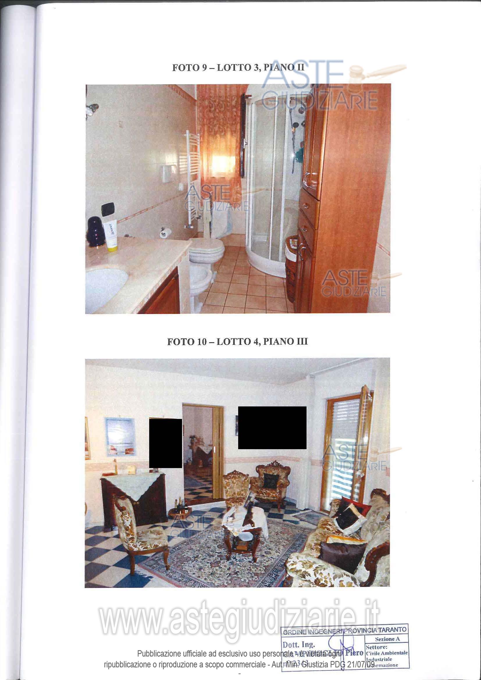 Vendita all'asta Senza incanto, con gara telematica asincrona - LOTTO 3: Lotto 3. Appartamento ubicato in Palagiano (TA) alla Via Quasimodo n. 15, posto al terzo piano, composto da ingresso, soggiorno, camera da letto, cucina-sala da pranzo ed un bucataio per una superficie utile di circa 110 mq. oltre un balcone prospicente il cortile interno di circa 10 mq. Prezzo base € 37.969,00 (offerta minima € 28.477,00). Data inizio operazioni di vendita: 21/01/2026 ore 16:00. Giudice Federica Rotondo. Professionista delegato alla vendita Avv. Roberto Pugliese. Custode Giudiziario Avv. Roberto Pugliese - Email "puglieseavvroby@libero.it"; Cell. 393056250; Tel. 0994508622. Rif. Tribunale di Taranto - Contenzioso civile n. 7241/2009