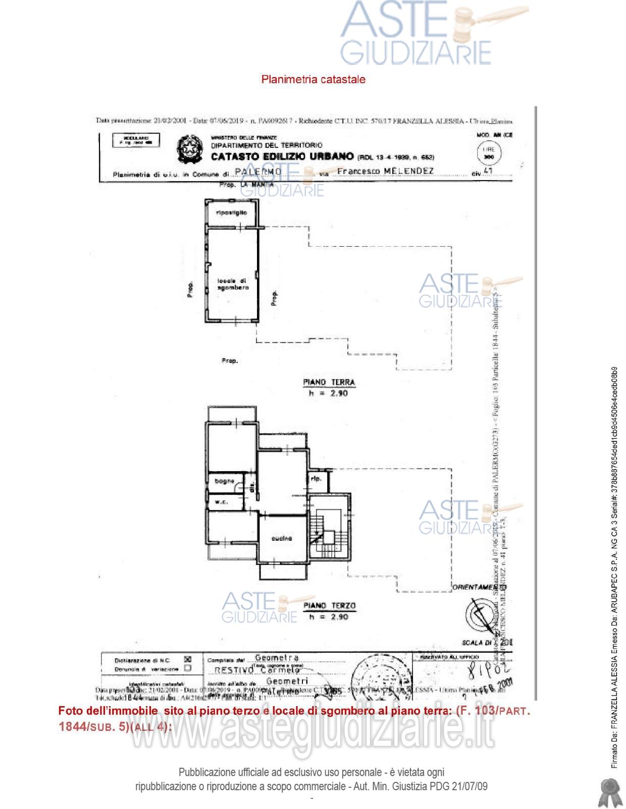 Vendita all'asta Senza incanto, con gara telematica sincrona mista - LOTTO 4: Quota di ½ di nuda proprietà e quota di ½ di piena proprietà di immobile facente parte di un edificio sito in Palermo, via Francesco Melendez n. 41 (Contrada Ciaculli), così composto: piano T (locale di sgombero) e piano 3 (appartamento), identificato in Catasto Fabbricati al foglio 103, particella 1844 sub 5, categoria A/2, zona censuaria 2, classe 5 consistenza 6,5 vani, superficie catastale totale 144 mq., escluse aree scoperte mq. 136 mq., rendita € 352,48, Via Francesco Melendez n. 41, piano T-3. Prezzo base € 34.425,00 (offerta minima € 25.819,00). Data vendita 24/04/2026 ore 10:00. Giudice Valentina Imperiale.