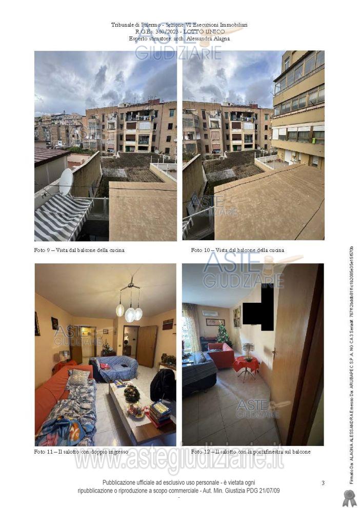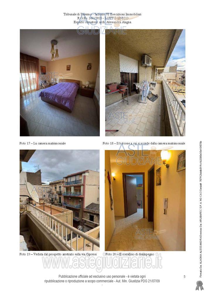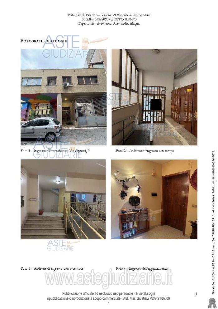 Vendita all'asta Senza incanto, con gara telematica sincrona mista - LOTTO UNICO: Piena proprietà dell’appartamento sito in Palermo, Via Cipressi, 9, piano terzo, scala A, int. 4, al Catasto Fabbricati di Palermo al Foglio 51, Part.lla 2322, Sub 26, Z.C. 2, cat. A/2, Classe 6, Consistenza 6 vani, sup. cat. 140,00 mq, Rendita € 387,34, composto da ingresso, salone pari a due vani, due camere da letto di cui una matrimoniale, cucina, riposti-glio, WC bagno, WC doccia, disimpegno. L’appartamento, come da atto di compravendita, è dotato di posto auto coperto nello scantinato dell’edificio. Prezzo base € 70.031,25 (offerta minima € 52.523,44). Data vendita 16/04/2026 ore 12:15. Professionista delegato alla vendita Avv. Giuseppe Costanzo - Email "avv.gcostanzo@gmail.com"; Cell. 3333630223; Tel. 091322408. Custode Giudiziario Avv. Giuseppe Costanzo - Email "avv.gcostanzo@gmail.com"; Cell. 3333630223; Tel. 091322408. Rif. Tribunale di Palermo - Espropriazione immobiliare (cartabia) n. 360/2023