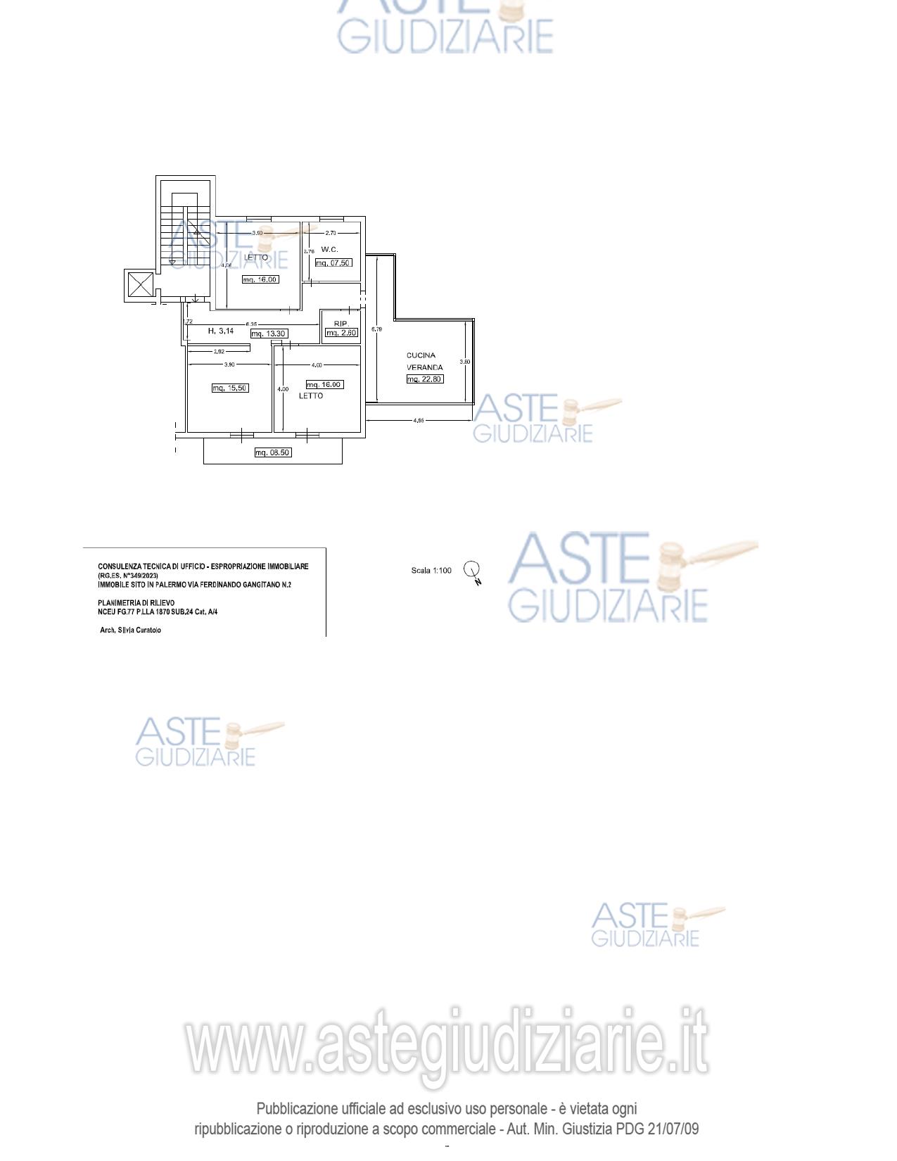 Vendita all'asta Senza incanto, con gara telematica sincrona mista - LOTTO UNICO: Piena proprietà dell'appartamento per civile abitazione, in Palermo, via Ferdinando Gangitano (oggi via A.Contorno) n.2, vani 5, al NCEU del comune di Palermo al Fg. 77 P.lla 1870, sub. 24, cat. A/3, al piano 2, sup.catastale mq. 87,00 escluse aree scoperte, sup.commerciale mq. 96,00 incluse aree scoperte, al piano secondo salendo a sinistra, con ascensore e scala unica. Composto da: ingresso, tre vani, WC, ripostiglio, terrazzo coperto trasformato in veranda adibita a cucina. Prezzo base € 54.750,00 (offerta minima € 41.062,50). Data vendita 21/01/2026 ore 14:30. Professionista delegato alla vendita Avv. Carmen Marchese Ragona - Email "cmarcheseragona@libero.it"; Cell. 3392854820; Tel. 3392854820. Custode Giudiziario Avv. Carmen Marchese Ragona - Email "cmarcheseragona@libero.it"; Cell. 3392854820; Tel. 3392854820. Rif. Tribunale di Palermo - Espropriazione immobiliare (cartabia) n. 349/2023