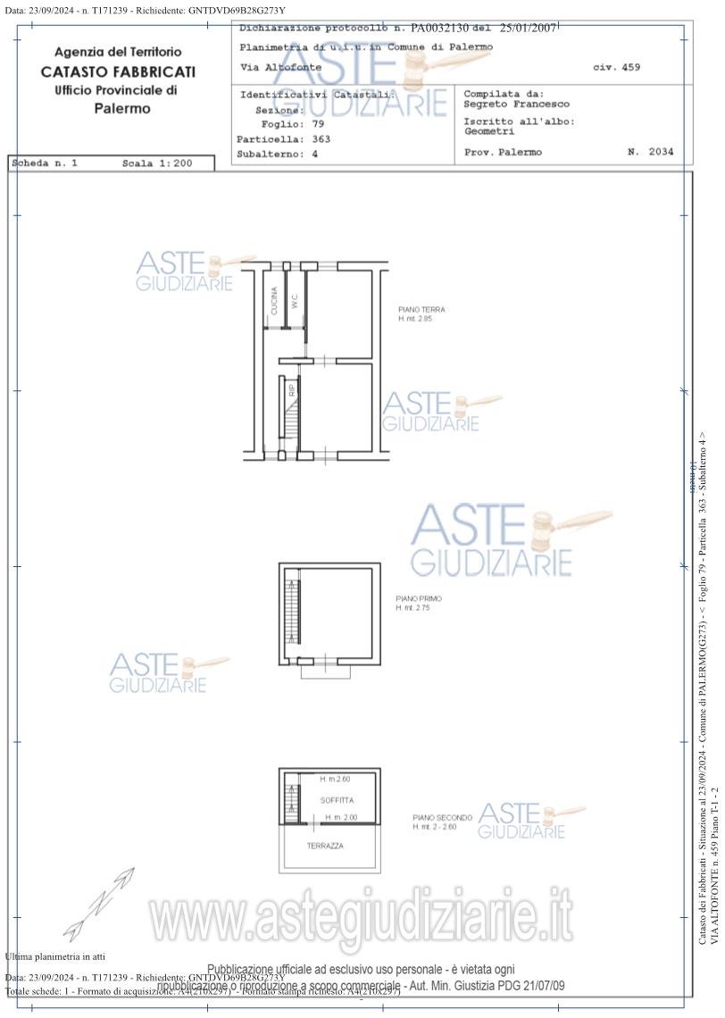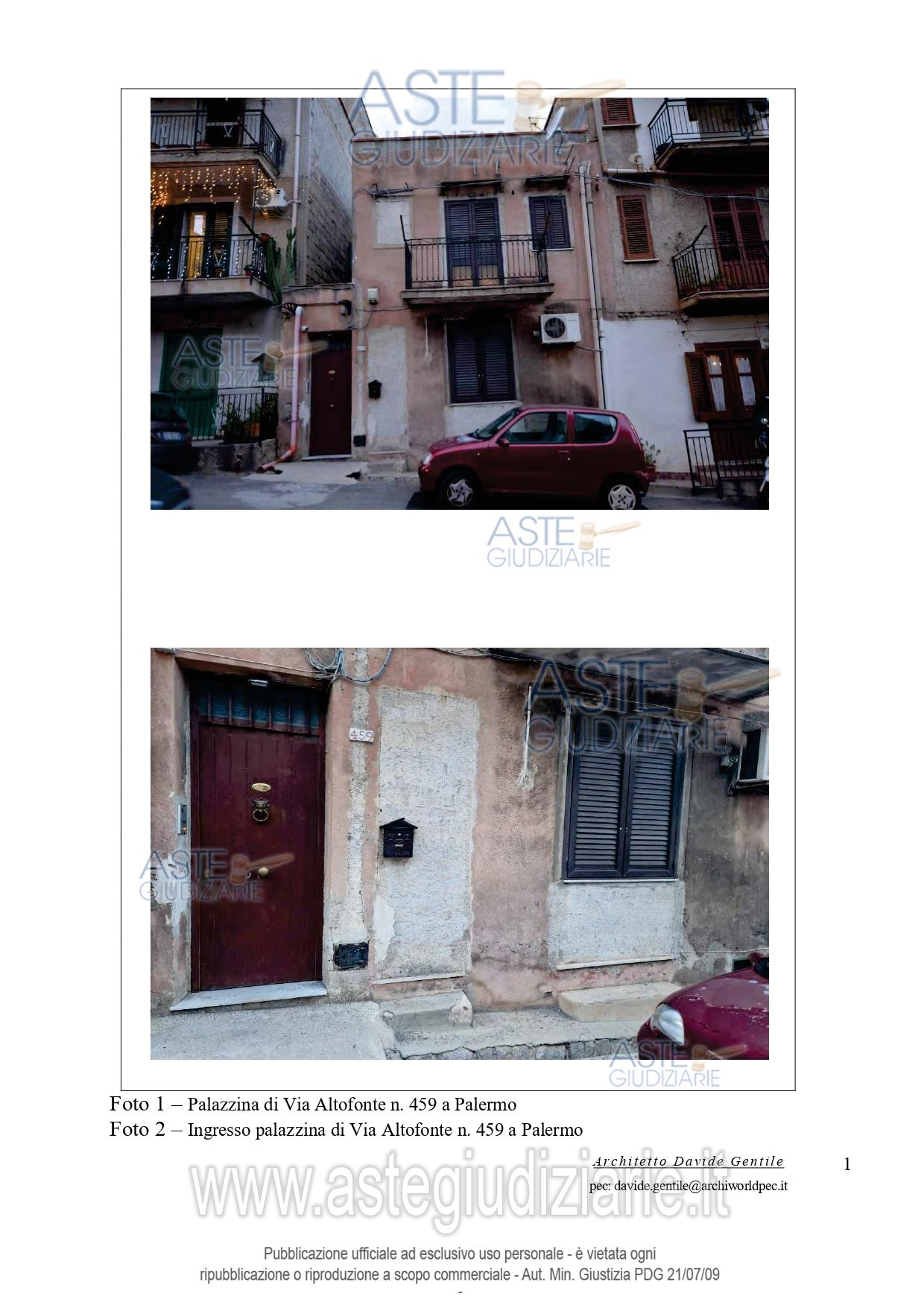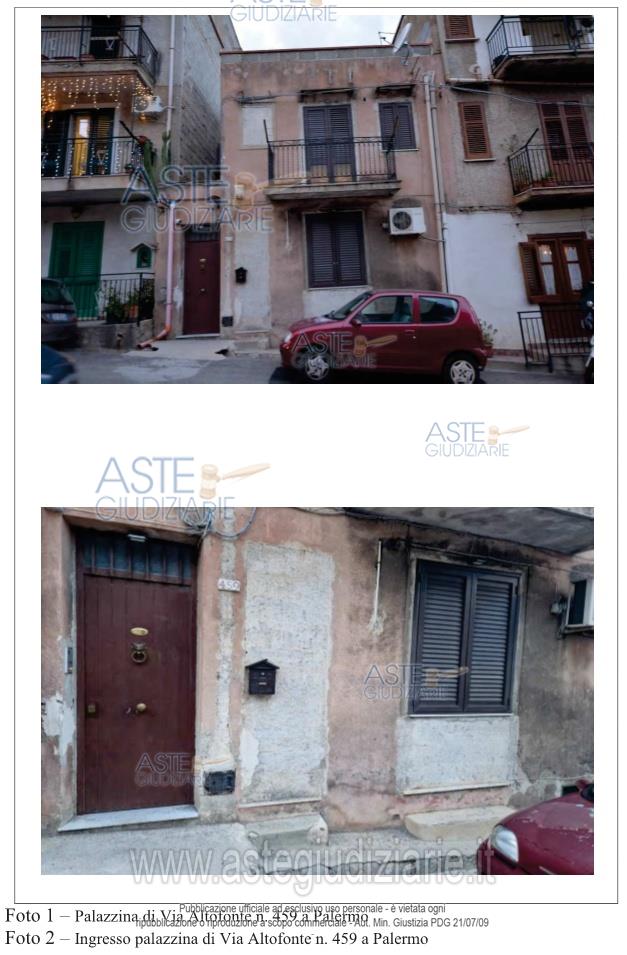 Vendita all'asta Senza incanto, con gara telematica sincrona mista - LOTTO UNICO: Piena proprietà immobile in Palermo, Via Altofonte n° 459, iscritto al Catasto fabbricati del Comune di Palermo al Foglio 79 particella 363 sub 4 (ex sub. 1 e sub. 2) piano terra, l° e 2°, cat. A/4, (abitazioni di tipo popolare), consistenza: Superficie catastale totale 117 m2 (totale escluse aree scoperte 112 m2), RC € 190,31. Prezzo base € 31.575,00 (offerta minima € 23.682,00). Data vendita 31/03/2026 ore 11:30. Professionista delegato alla vendita Avv. Monica Galluzzo - Email "avv.monicagalluzzo@gmail.com". Custode Giudiziario Avv. Monica Galluzzo - Email "avv.monicagalluzzo@gmail.com". Rif. Tribunale di Palermo - Esecuzione immobiliare post legge 80 n. 287/2023
