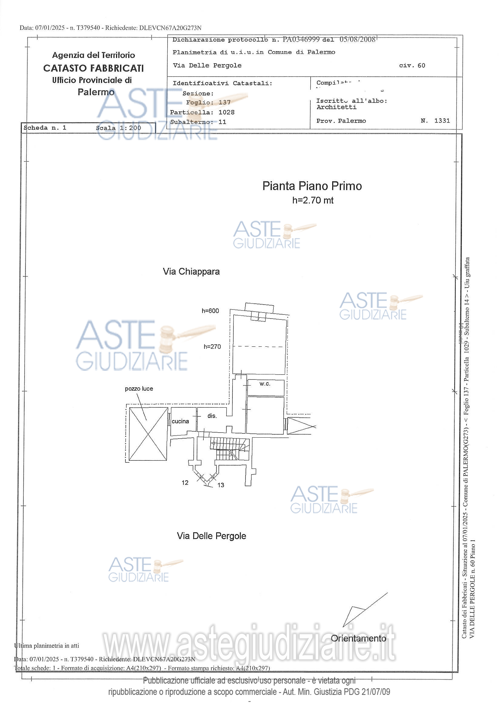 Vendita all'asta Senza incanto, con gara telematica sincrona mista - LOTTO UNICO: Piena proprietà di Appartamento sito in Palermo, Via delle Pergole n. 60 composto da disimpegno, piccola cucina con finestra su chiostrina interna, corridoio, camera singola con finestra su pozzo luce, servizio igienico privo di apertura diretta e con areazione forzata, grande camera doppia con porta/finestra e balcone. Prezzo base € 90.000,00 (offerta minima € 67.500,00). Data vendita 21/05/2026 ore 16:00. Professionista delegato alla vendita Avv. Fausta Firrarello - Email "esecuzionipalermo@gmail.com"; Tel. 0917303140. Custode Giudiziario Avv. Fausta Firrarello - Email "esecuzionipalermo@gmail.com"; Tel. 0917303140. Rif. Tribunale di Palermo - Espropriazione immobiliare (cartabia) n. 527/2023