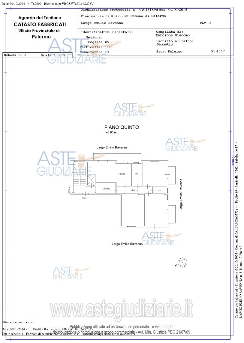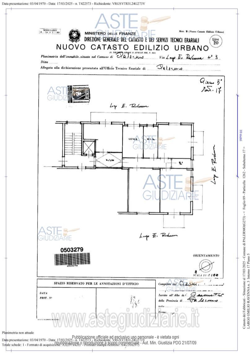 Vendita all'asta Senza incanto, con gara telematica sincrona mista - LOTTO UNICO: 1/1 appartamento facente parte di un edificio ubicato a Palermo in Largo Emilio Ravenna n. 3, ultimo condominio a sinistra denominato Largo Emilio Ravenna n. 1, Piano Quinto interno 17. Prezzo base € 85.000,00 (offerta minima € 63.750,00). Data vendita 16/04/2026 ore 11:00. Professionista delegato alla vendita Avv. Maurizio Pizzuto - Email "pizzuto.maurizio@libero.it"; Cell. 3466063944. Custode Giudiziario Avv. Maurizio Pizzuto - Email "pizzuto.maurizio@libero.it"; Cell. 3466063944. Rif. Tribunale di Palermo - Esecuzione immobiliare post legge 80 n. 509/2023