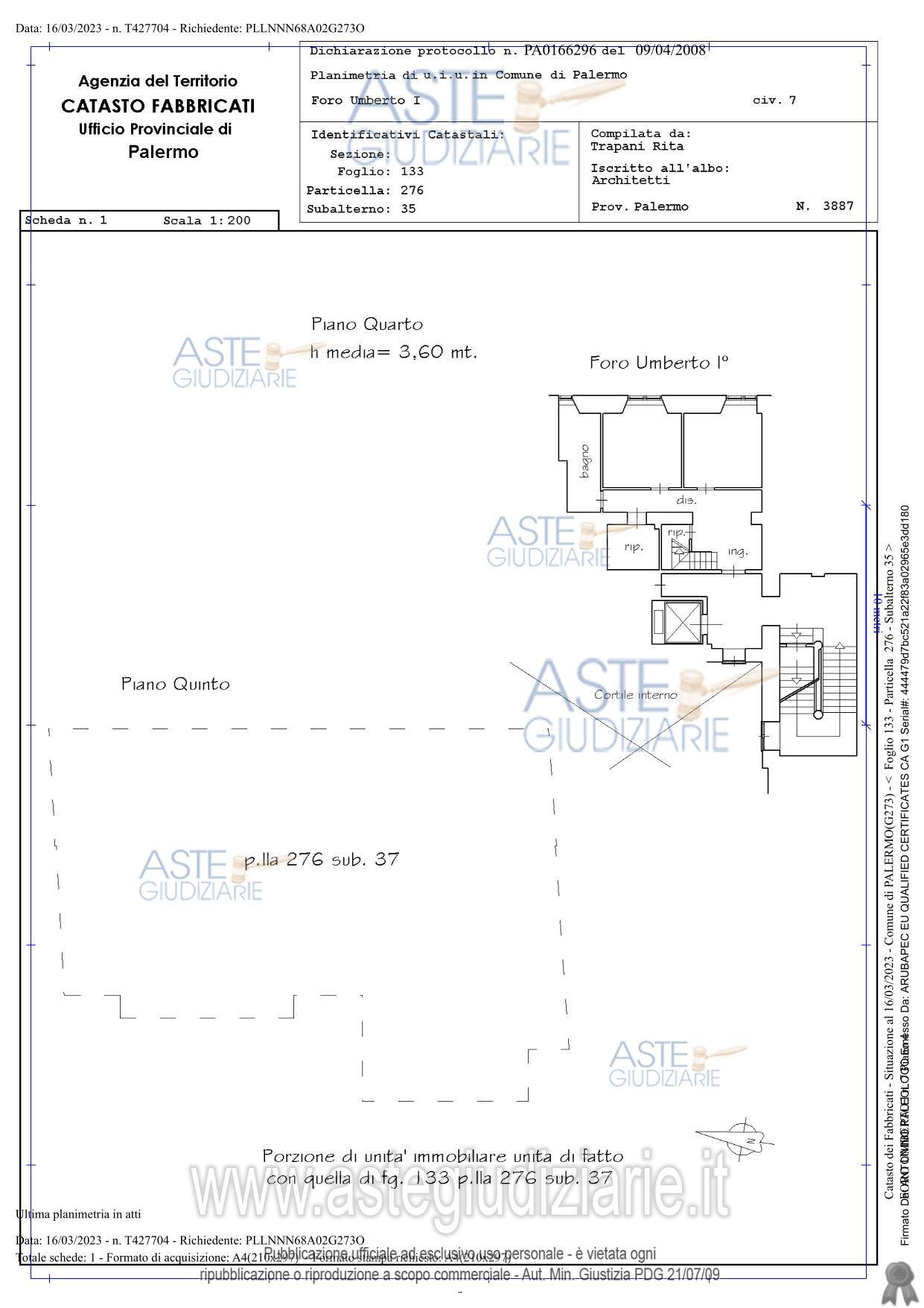 Vendita all'asta Senza incanto, con gara telematica sincrona mista - LOTTO UNICO: Appartamento facente parte dell’edificio ubicato nel Comune di Palermo (Ex Albergo Trinacria) con accesso da Foro Umberto I n.7, posto al piano quarto lato mare. Prezzo base € 143.500,00 (offerta minima € 107.625,00). Data vendita 29/04/2026 ore 15:30. Professionista delegato alla vendita Avv. Calogero Pisciotta - Email "pisciotta.avvocato@gmail.com". Custode Giudiziario Avv. Calogero Pisciotta - Email "pisciotta.avvocato@gmail.com". Rif. Tribunale di Palermo - Esecuzione immobiliare post legge 80 n. 78/2022