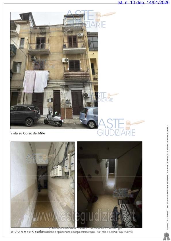 Vendita all'asta Senza incanto, con gara telematica sincrona mista - LOTTO UNICO: Piena proprietà dell’appartamento sito in Palermo, Corso dei Mille n. 979, piano primo, sup. comm. complessiva mq 64,26; identificato al Catasto dei Fabbricati del Comune di Palermo al fg. 89, p.lla 895, sub. 9, zona censuaria 2, categoria A/3 (abitazioni di tipo economico), classe 4, consistenza 4,5 vani, superficie catastale totale 74 mq, escluse aree scoperte 73 mq, rendita € 185,92. Prezzo base € 44.000,00 (offerta minima € 33.000,00). Data vendita 23/06/2026 ore 09:30. Professionista delegato alla vendita: Avv. Daniela Pischedda - Email "assoveda@gmail.com".