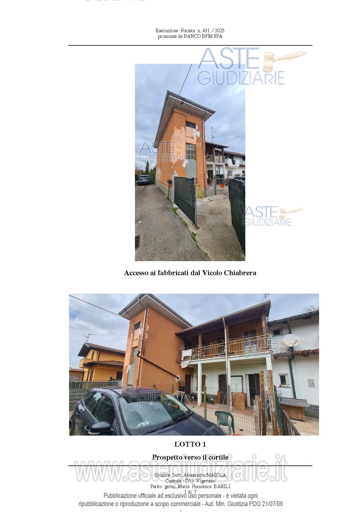 Vendita in attesa dell'emissione del nuovo bando d'asta. LOTTO 1: Fabbricato residenziale, disposto a piano terra e primo, con accesso pedonale dal civico 4 di Vicolo Chiabrera 4, attraverso il cortile. La casa di abitazione è composta a piano terra da porticato esterno, una cucina e un soggiorno; una scala interna a due rampe collega il piano terra al primo, dove si trovano due camere, di cui una con balcone e un piccolo bagno. L’abitazione presenta una superficie commerciale lorda di mq 130,19. Occupato senza titolo. Ultimo prezzo base € 33.199,00 (offerta minima € 24.899,00). Giudice Alessandro Maiola. Professionista delegato alla vendita Avv. Maria Laura Cornalba - Email "laura.cornalba@virgilio.it"; Tel. 0382477762. Custode Giudiziario Istituto Vendite Giudiziarie Srl Ifir Piemonte - Email "immobiliarivigevano@ifir.it"; Tel. 0381691137. Rif. Tribunale di Pavia - Espropriazione immobiliare (cartabia) n. 431/2023