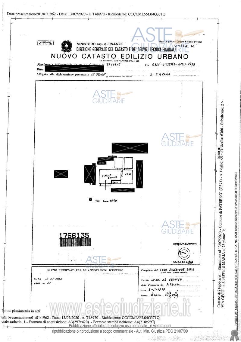 Vendita in attesa dell'emissione del nuovo bando d'asta. LOTTO 2: Paternò Via Gesù, Giuseppe e Maria n° 75, PT, sup mq. 82. Agenzia Territorio CT – CF Comune : - Fg 60, part 6366, sub. 2, cat. A/5, cl. 2, cons 2,5 vani catastali, sup cat. tot. 31 mq., tot escl aree scop. 31 mq., rendita € 72,30, Via Gesù, Giuseppe e Maria n° 75 piano T; - particella 6366 sub. 1 (già p.lle graff 6138 e 6366 sub. 1), cat. A/4, cl 3, cons 2,5 vani catastali, sup. cat tot 62 mq., tot escl aree scop 62 mq., rendita € 87,80, Via Gesù, Giuseppe e Maria n° 75 piano T. Ultimo prezzo base € 19.968,75 (offerta minima € 14.976,56). Professionista delegato alla vendita Avv. Francesco Grasso Leanza - Email "francescograssoleanza@email.it"; Cell. 3479110415. Custode Giudiziario Avv. Francesco Grasso Leanza - Email "francescograssoleanza@email.it"; Cell. 3479110415. Rif. Tribunale di Catania - Esecuzione immobiliare post legge 80 n. 1133/2017