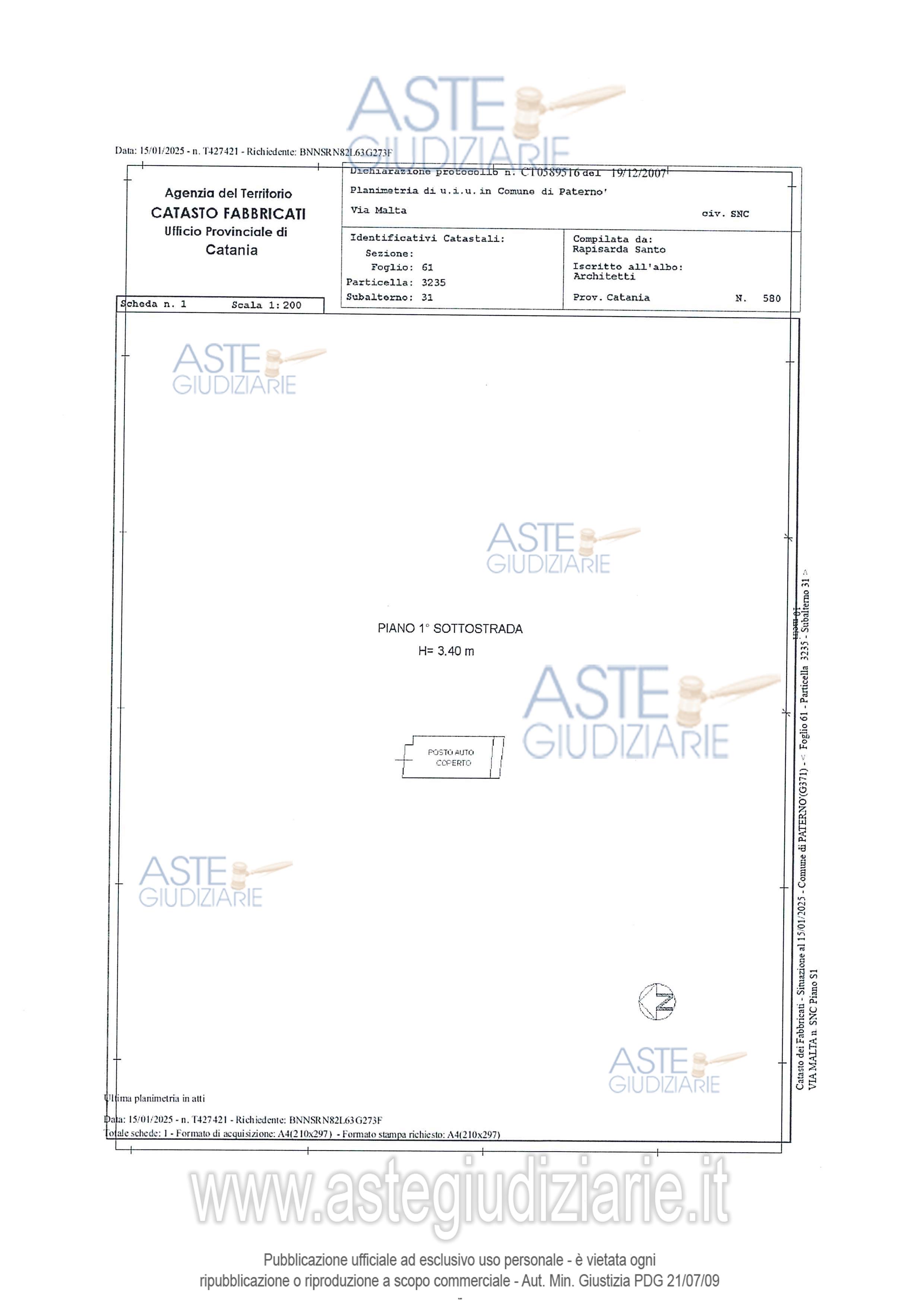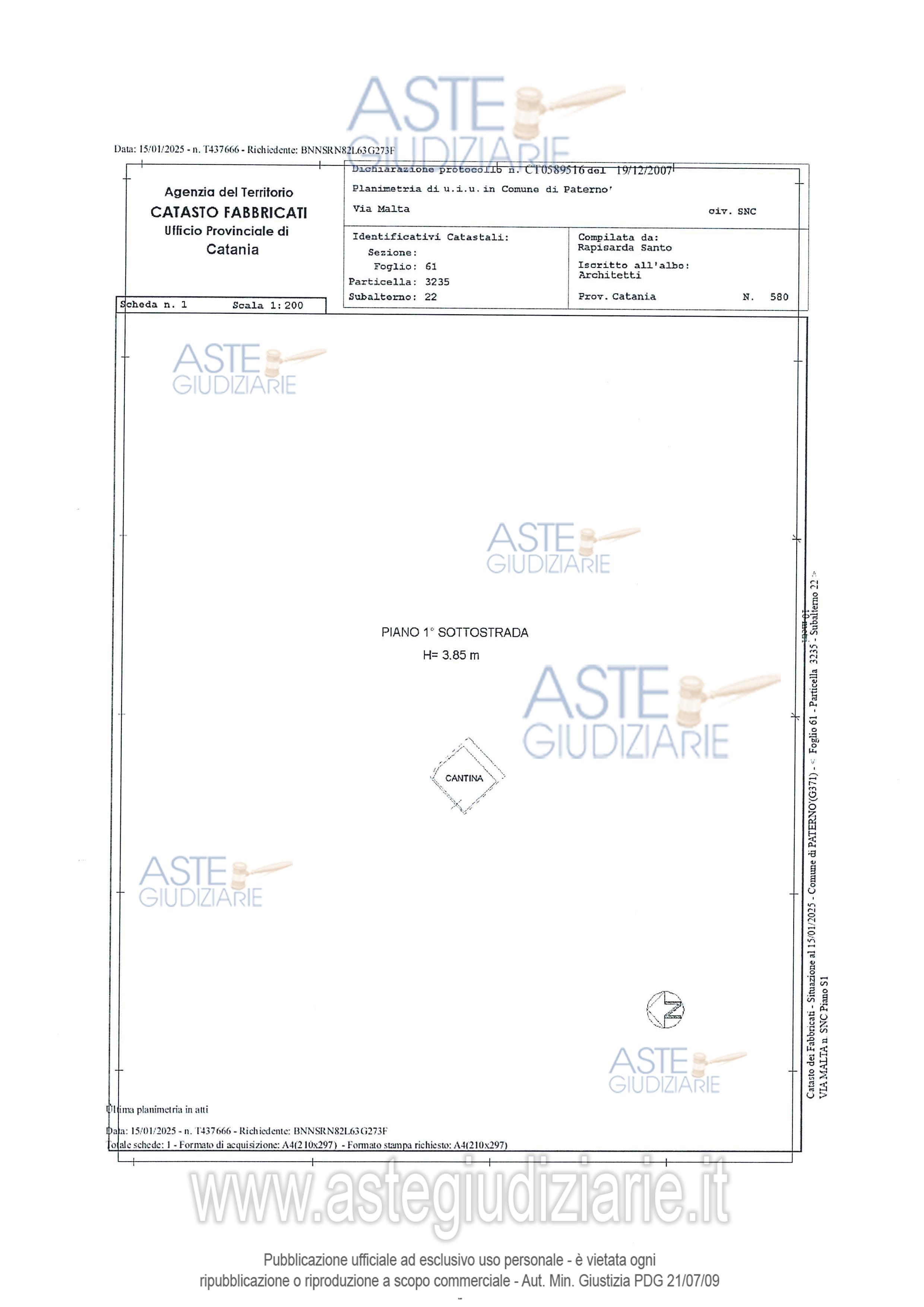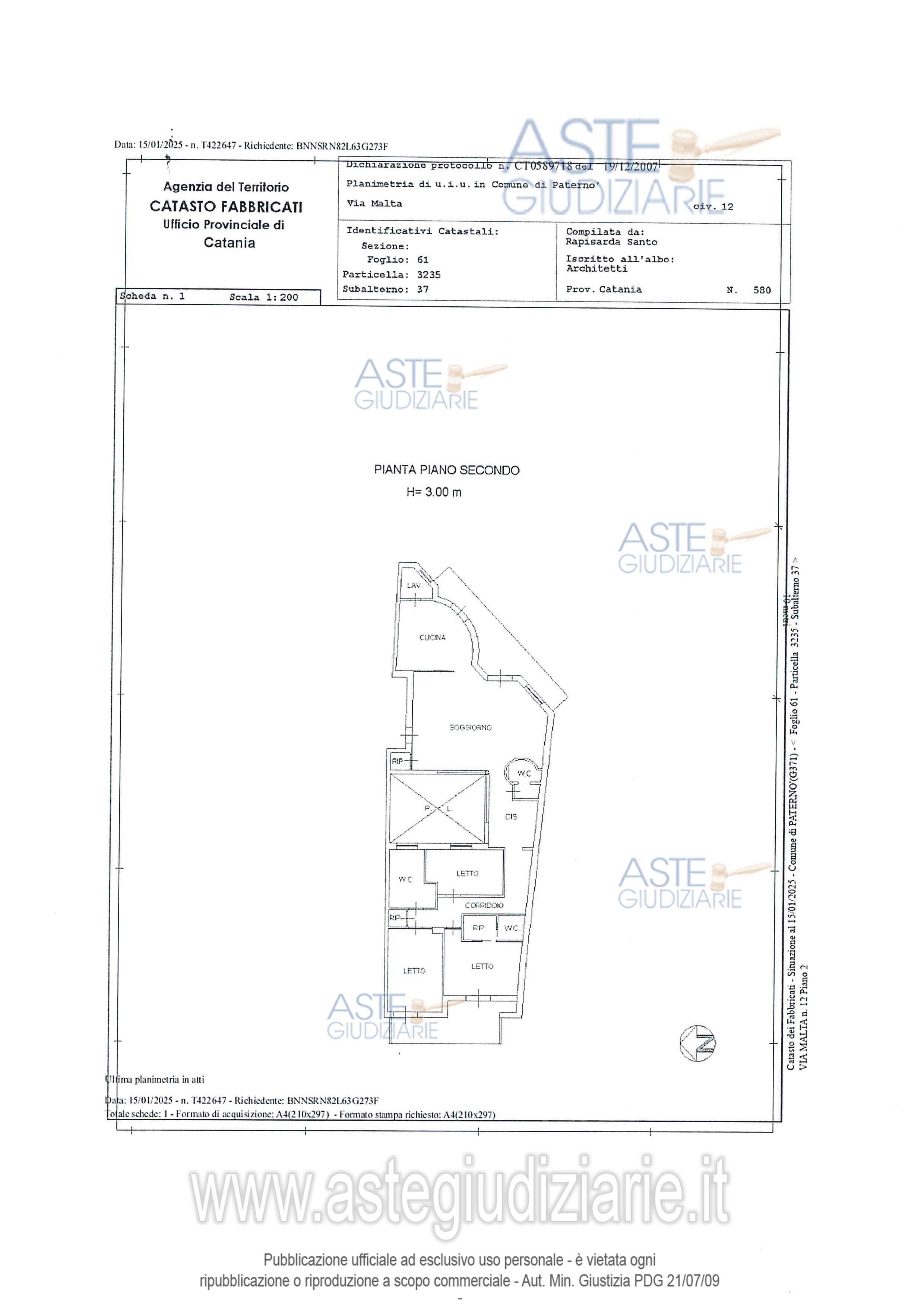Vendita all'asta Senza incanto, con gara telematica sincrona mista - LOTTO UNICO: LOTTO UNICO Piena proprietà di Appartamento per civile abitazione sito in Paternò, via Malta n. 5, posto al piano secondo, composto da tre camere da letto, un openspace che include cucina, lavanderia e soggiorno, oltre accessori, con annesse Cantina e Posto Auto Coperto ubicate al piano seminterrato dello stesso fabbricato. Prezzo base € 86.250,00 (offerta minima € 64.687,50). Data vendita 14/01/2026 ore 10:00. Professionista delegato alla vendita Avv. Daniela Furia - Email "daniela.furia@tiscali.it"; Tel. 095388875. Custode Giudiziario Avv. Daniela Furia - Email "daniela.furia@tiscali.it"; Tel. 095388875. Rif. Tribunale di Catania - Esecuzione immobiliare post legge 80 n. 582/2021