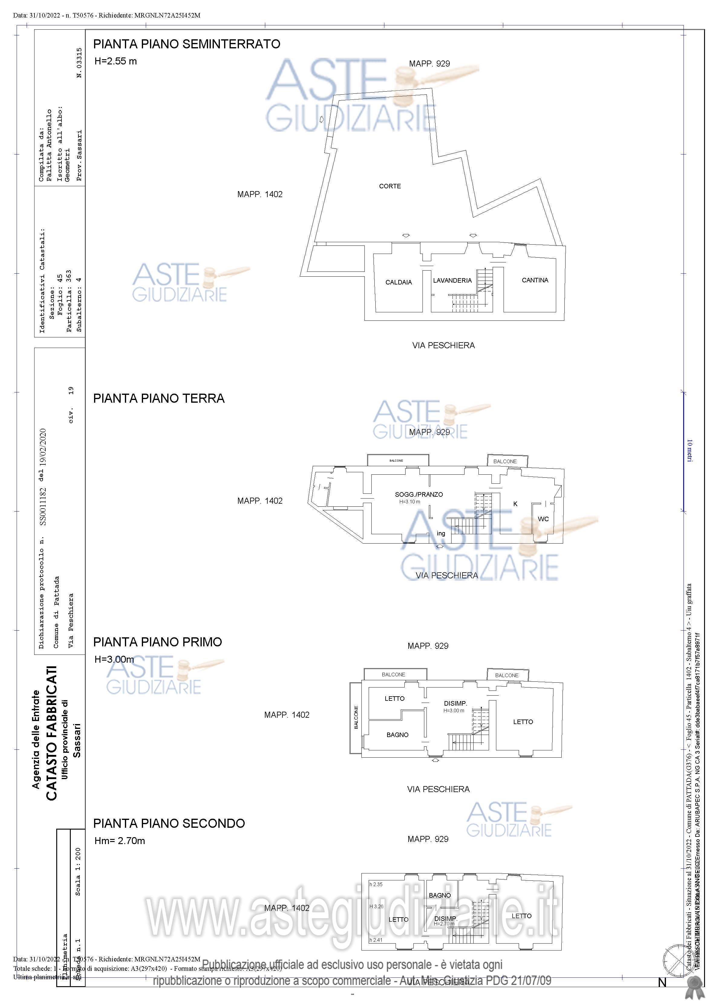 Vendita all'asta Senza incanto - LOTTO UNICO: Intera proprietà fabbricato uso civile abitazione sito in Comune di Pattada in Via Peschiera n.19, costituito da piano terra, primo, secondo e seminterrato, con corte esclusiva, distinto al NCEU Foglio 45, mappale 363 sub. 4 e mappale 1402 sub.4 Categoria A/3 cl U, vani 10,5. Sussistono difformità edilizie sanabili con accertamento conformità e catastali da regolarizzare con variazione catastale come da perizia cui si rimanda. Prezzo base € 104.625,00 (offerta minima € 78.468,75). Data vendita 16/04/2026 ore 17:00. Professionista delegato alla vendita Avv. Fernando Pes - Email "info.slpessassari@gmail.com"; Tel. 079234722. Custode Giudiziario Istituto Vendite Giudiziarie Sassari - Email "visitaivgsassari@gmail.com"; Tel. 079260228. Rif. Tribunale di Sassari - Contenzioso civile n. 374/2021