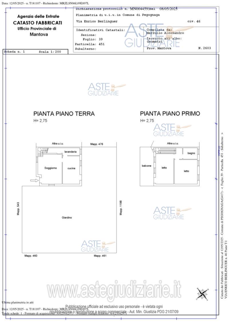 Vendita all'asta Senza incanto, con gara telematica sincrona mista - LOTTO UNICO: Villetta a schiera sviluppantesi su due piani fuori terra, facente parte di complesso residenziale e composta: al piano terra, da ingresso-soggiorno, cucina, lavanderia e vano scale; al piano primo, da vano scale, disimpegno, due camere da letto, bagno e balcone; con annessa area cortiliva al piano terra, ad uso giardino; con garage. Prezzo base € 68.850,00 (offerta minima € 51.638,00). Data vendita 16/04/2026 ore 15:00. Giudice Mauro Pietro Bernardi. Professionista delegato alla vendita Dott. Sergio Pajola - Email "SERGIO.PAJOLA@DOTTCOM.INFO". Custode Giudiziario Sovemo Srl - Email "immobiliare@sovemo.com". Rif. Tribunale di Mantova - Espropriazione immobiliare (cartabia) n. 7/2025