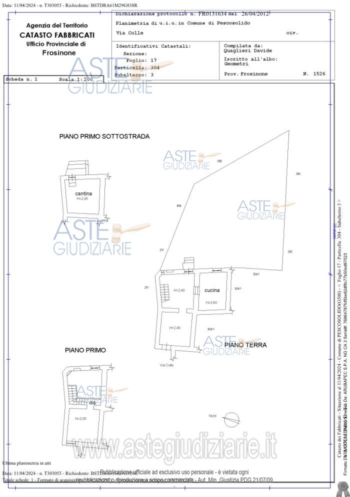 Vendita all'asta Senza incanto, con gara telematica asincrona - LOTTO UNICO: Abitazione di tipo popolare sita in Via Colle n.38, Pescosolido (FR), su tre piani S1-T-1, costituita da un fabbricato per civile abitazione in muratura ubicato nel centro storico. Identificato al catasto Fabbricati - Foglio 17, Part. 304, Sub. 3, Cat. A/4, Classe 3, Vani 6,5. Cantina ubicata in Pescosolido (FR) alla Via Colle, piano T, in un fabbricato in muratura ad unico livello ubicato nel centro storico. Identificato al catasto Fabbricati - Foglio 17, Part. 291, Categoria F/2. Prezzo base € 62.400,00 (offerta minima € 46.800,00). Data inizio operazioni di vendita: 28/05/2026 ore 10:00. Professionista delegato alla vendita Avv. Davide Ruscito - Email "davide.ruscito@libero.it"; Cell. 3283679242; Tel. 3283679242. Custode Giudiziario Avv. Davide Ruscito - Email "davide.ruscito@libero.it"; Cell. 3283679242; Tel. 3283679242. Rif. Tribunale di Cassino - Espropriazione immobiliare (cartabia) n. 15/2024