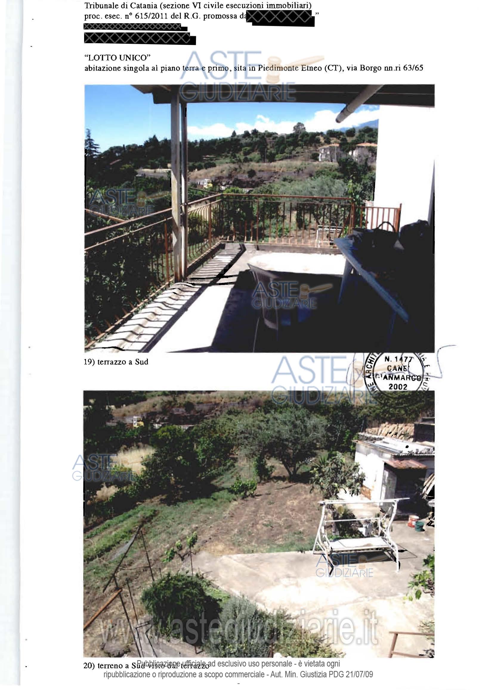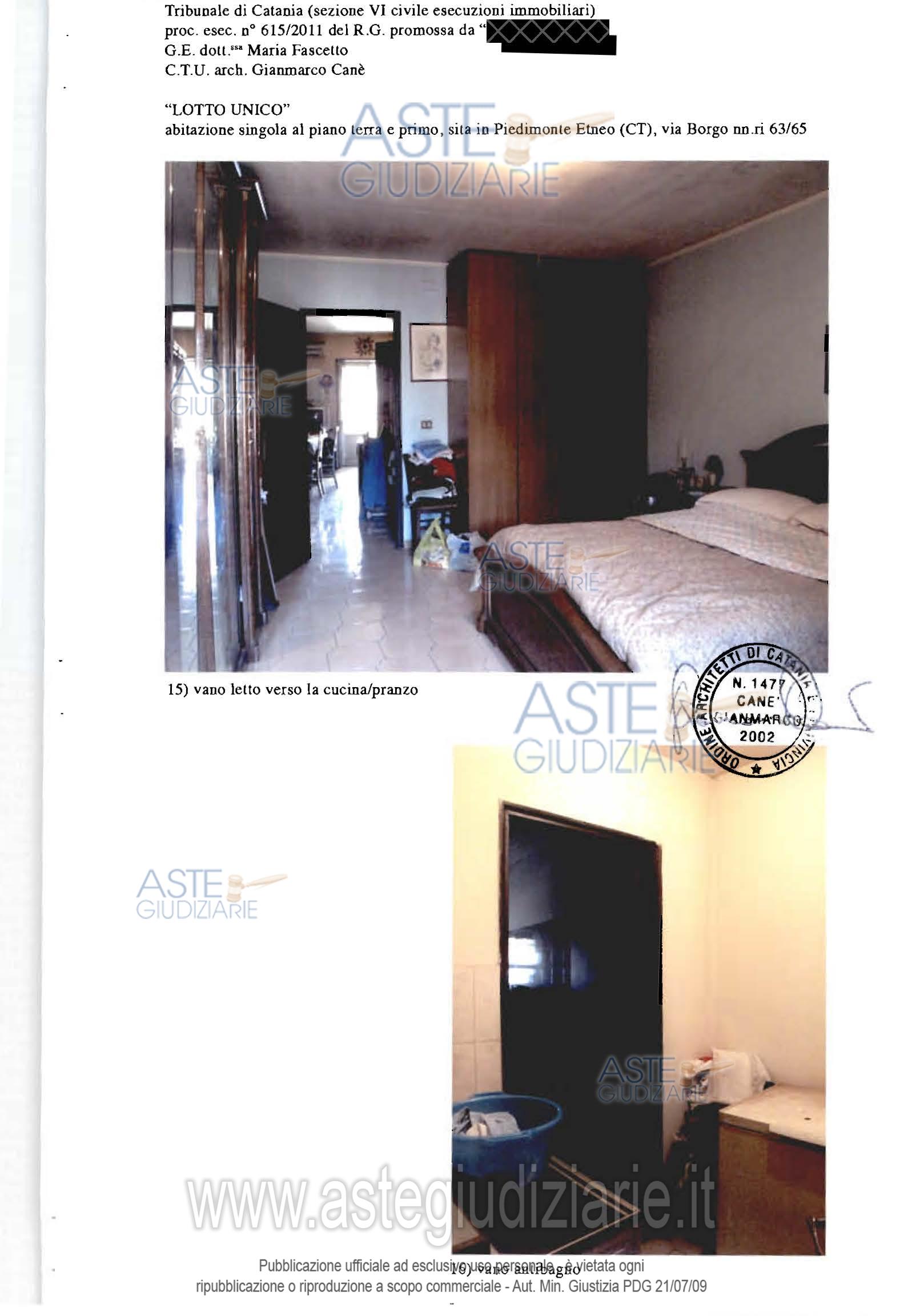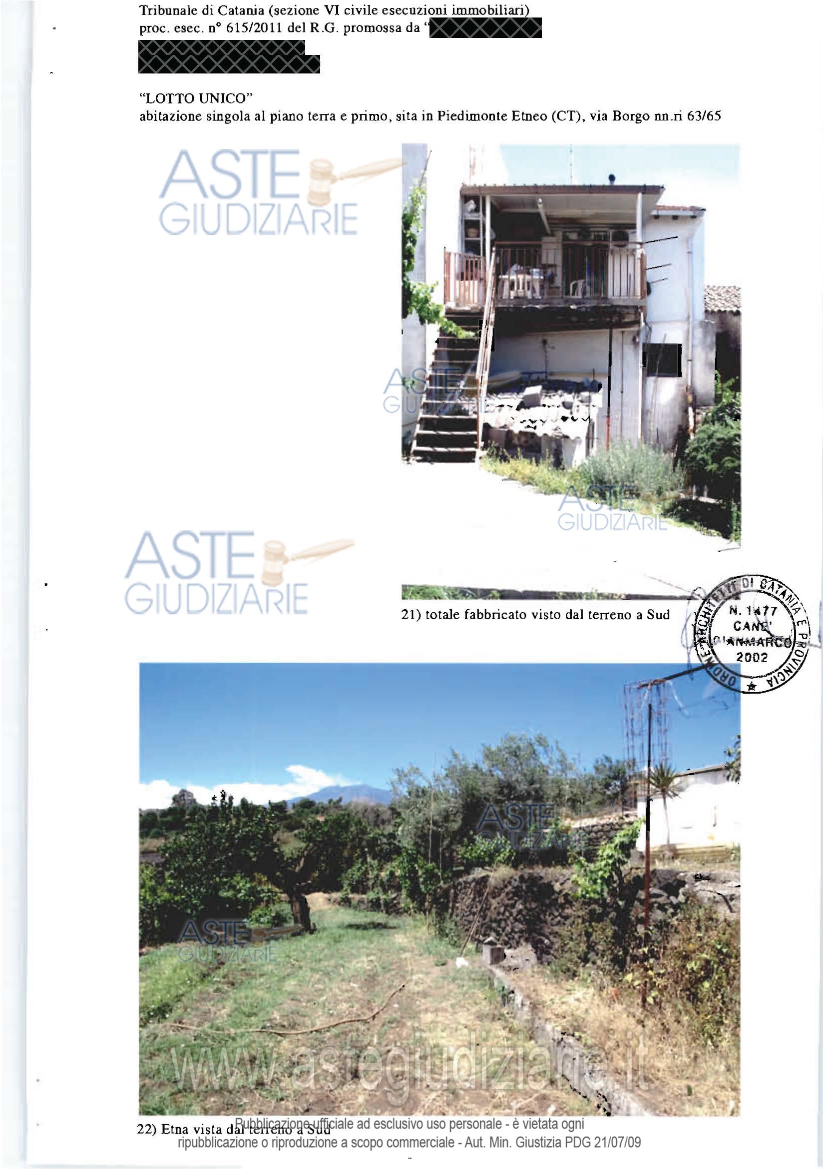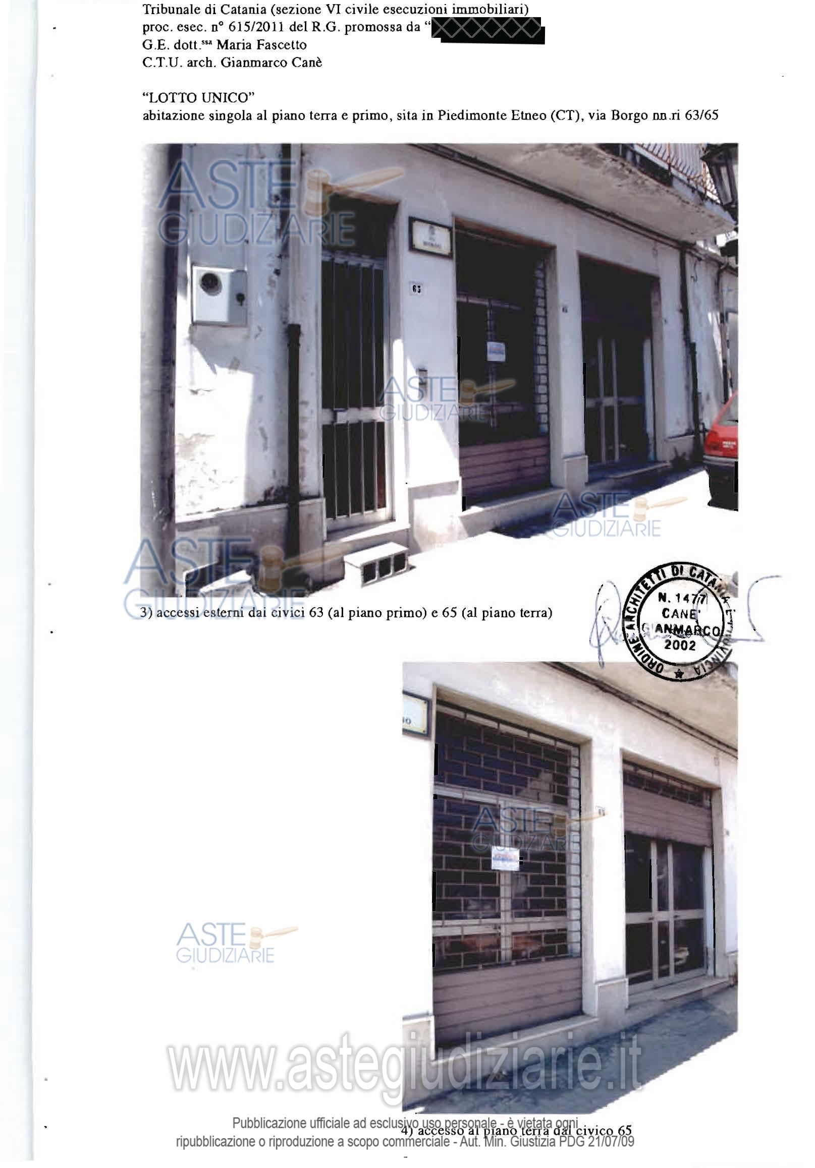 Vendita all'asta Senza incanto - LOTTO UNICO: Fabbricato sito a Piedimonte Etneo, via Borgo n.65, costituito da: a) bottega dislocata al piano terra della superficie di mq.70,00, cat. A/3; b) appartamento dislocato al piano primo, composto da un ingresso soggiorno e altri due vani ed un servizio igienico, della superficie di mq.70 circa, cat. A/5, ; c) terreno agricolo incolto, della superficie di circa 463 mq, con accesso sia dalla bottega che dall’appartamento (tramite scala esterna). Prezzo base € 79.875,00 (offerta minima € 59.906,25). Data vendita 04/03/2026 ore 18:30. Professionista delegato alla vendita Avv. Giampiero Maria Trovato - Email "info@studiolegaletrovato.it". Custode Giudiziario Avv. Giampiero Maria Trovato - Email "info@studiolegaletrovato.it". Rif. Tribunale di Catania - Esecuzione immobiliare post legge 80 n. 615/2011