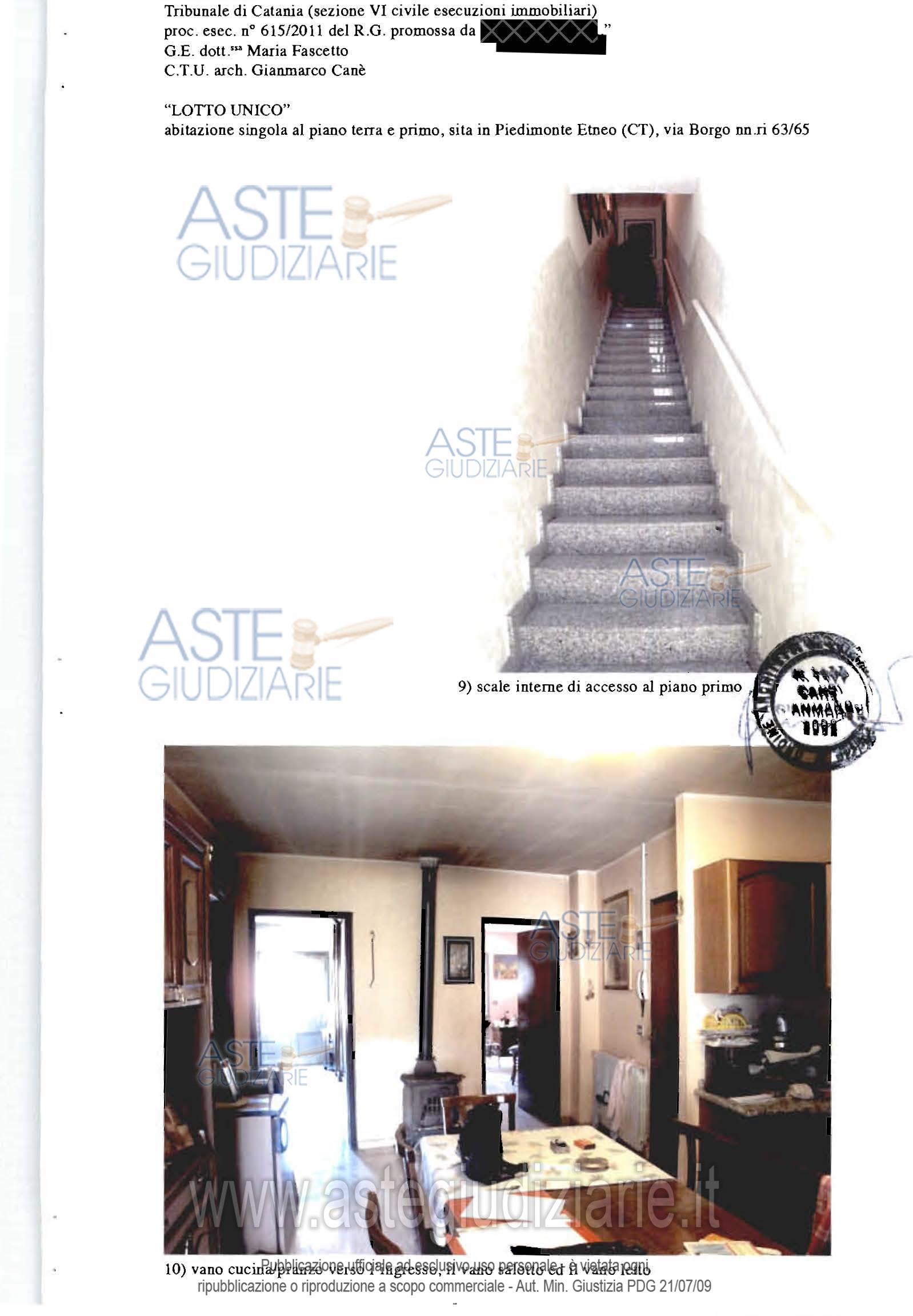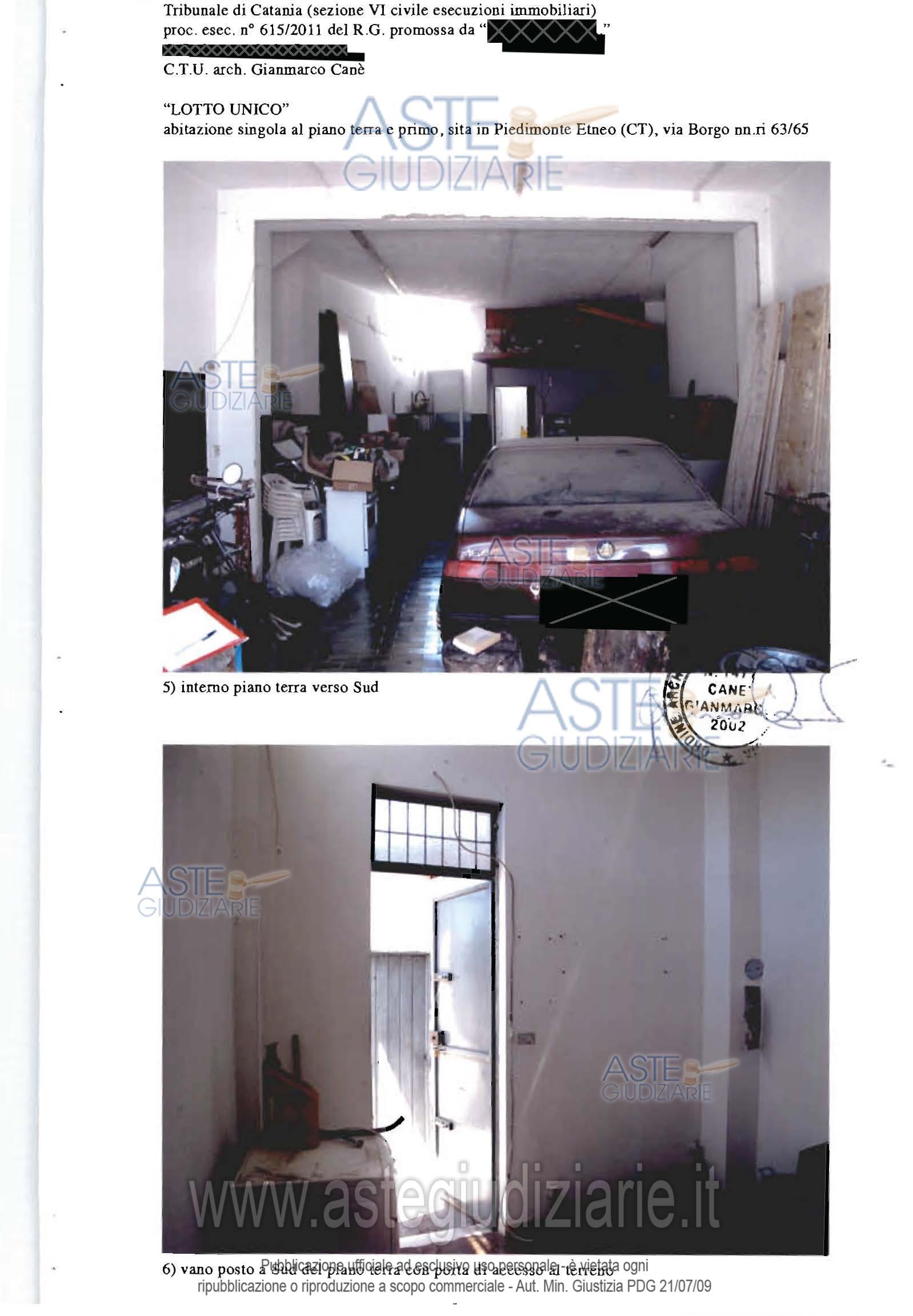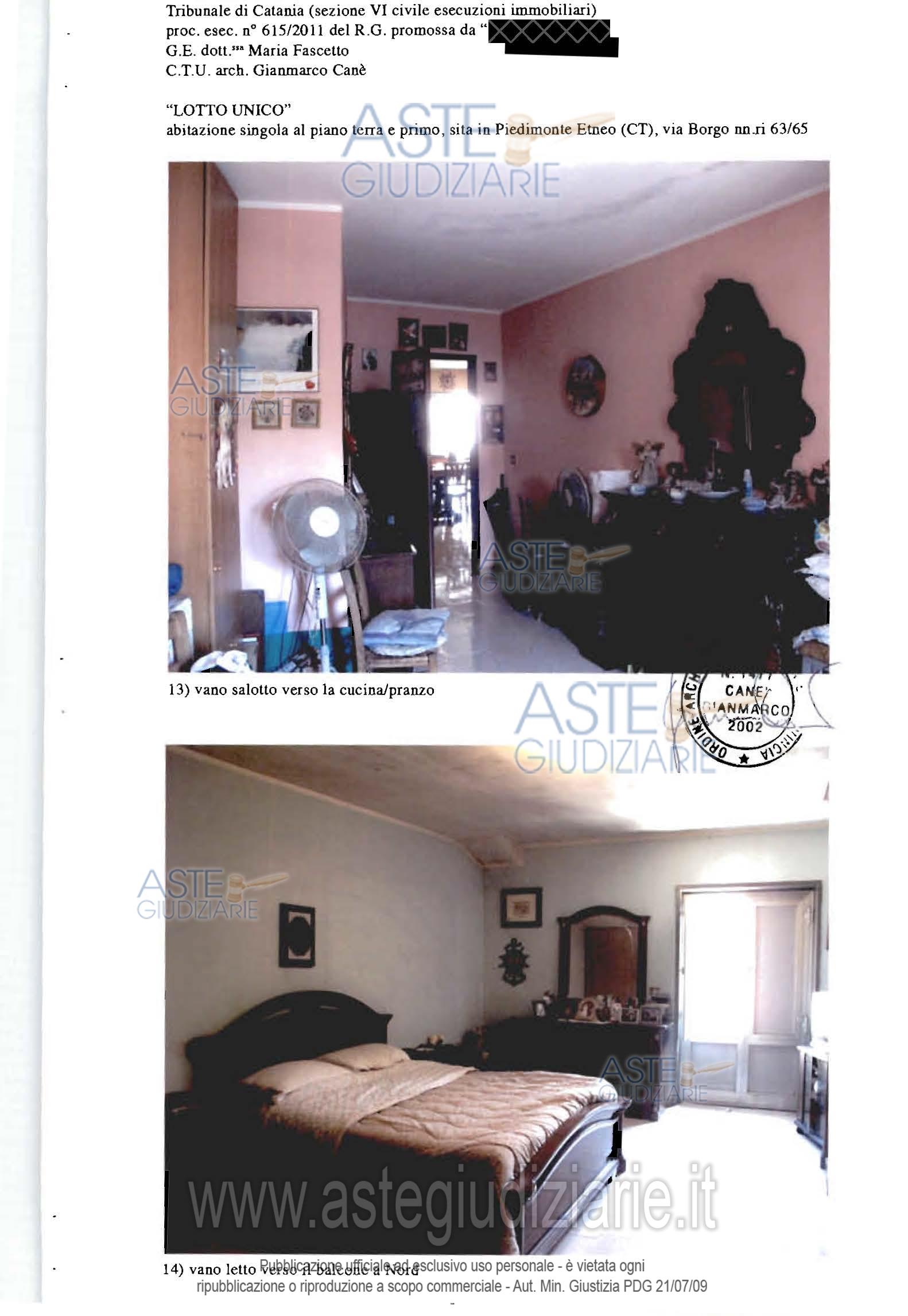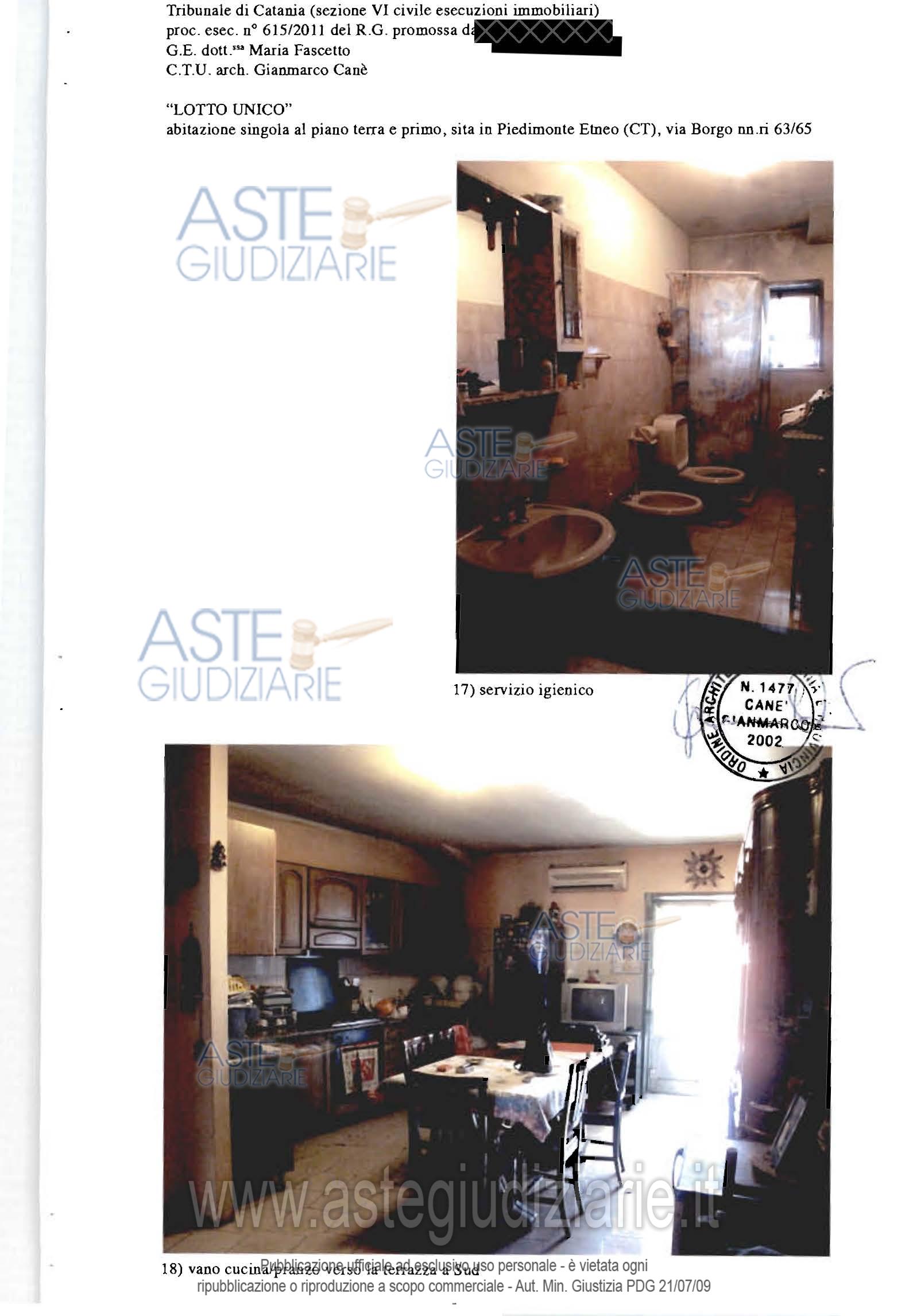 Vendita all'asta Senza incanto - LOTTO UNICO: Fabbricato sito a Piedimonte Etneo, via Borgo n.65, costituito da: a) bottega dislocata al piano terra della superficie di mq.70,00, cat. A/3; b) appartamento dislocato al piano primo, composto da un ingresso soggiorno e altri due vani ed un servizio igienico, della superficie di mq.70 circa, cat. A/5, ; c) terreno agricolo incolto, della superficie di circa 463 mq, con accesso sia dalla bottega che dall’appartamento (tramite scala esterna). Prezzo base € 79.875,00 (offerta minima € 59.906,25). Data vendita 04/03/2026 ore 18:30. Professionista delegato alla vendita Avv. Giampiero Maria Trovato - Email "info@studiolegaletrovato.it". Custode Giudiziario Avv. Giampiero Maria Trovato - Email "info@studiolegaletrovato.it". Rif. Tribunale di Catania - Esecuzione immobiliare post legge 80 n. 615/2011