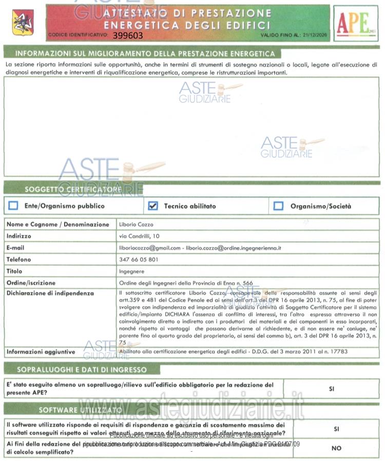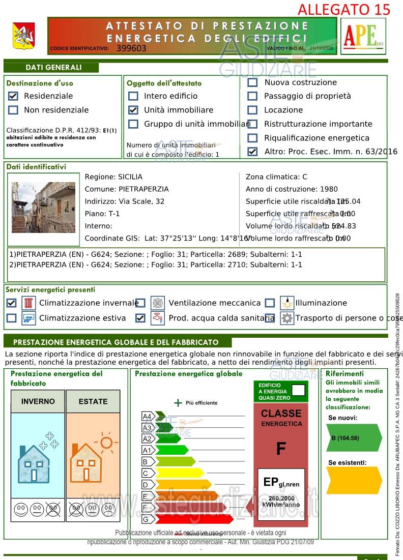 Vendita all'asta Senza incanto, con gara telematica sincrona mista - LOTTO UNICO: Immobile residenziale, struttura a schiera, costruito in cemento armato e muratura intorno alla fine anni 60' e sita in via Scale del Comune di Pietraperzia. Si compone di due livelli fuori terra e di un seminterrato con affaccio sulla via Fiume, per complessivi 7 vani catastali.L’abitazione comprende tre camere, cucina, soggiorno, due servizi e ripostigli. Il seminterrato è destinato ad autorimessa con ulteriori due ripostigli. I livelli sono collegati da scala interna. Prezzo base € 23.625,00 (offerta minima € 17.718,75). Data vendita 07/04/2026 ore 10:00. Professionista delegato alla vendita Avv. Valentina Saltalamacchia - Email "v.saltalamacchia@virgilio.it"; Cell. 3272017577; Tel. 093525606. Custode Giudiziario Avv. Valentina Saltalamacchia - Email "v.saltalamacchia@virgilio.it"; Cell. 3272017577; Tel. 093525606. Rif. Tribunale di Enna - Esecuzione immobiliare post legge 80 n. 63/2016