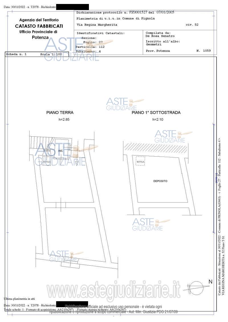 Vendita all'asta Senza incanto - LOTTO UNICO: Piena ed intera proprietà 1000/1000 di una abitazione ubicata in Pignola (PZ) alla Via Regina Margherita n. 52, riportata nel N.C.E.U. del Comune di Pignola (PZ) al Fg. 27 p.lla 112, sub 4, Piano T-S1, cat. A4, classe 5, consistenza 3,5 vani , superfice catastale 68 mq, rendita € 189,80. Prezzo base € 17.482,50 (offerta minima € 13.111,88). Data vendita 12/05/2026 ore 16:30. Professionista delegato alla vendita Avv. Piergiuseppe Metastasio - Email "avvmetastasio@gmail.com"; Cell. 3881564862; Tel. 0971289070. Custode Giudiziario Avv. Piergiuseppe Metastasio - Email "avvmetastasio@gmail.com"; Cell. 3881564862; Tel. 0971289070. Rif. Tribunale di Potenza - Esecuzione immobiliare post legge 80 n. 65/2020