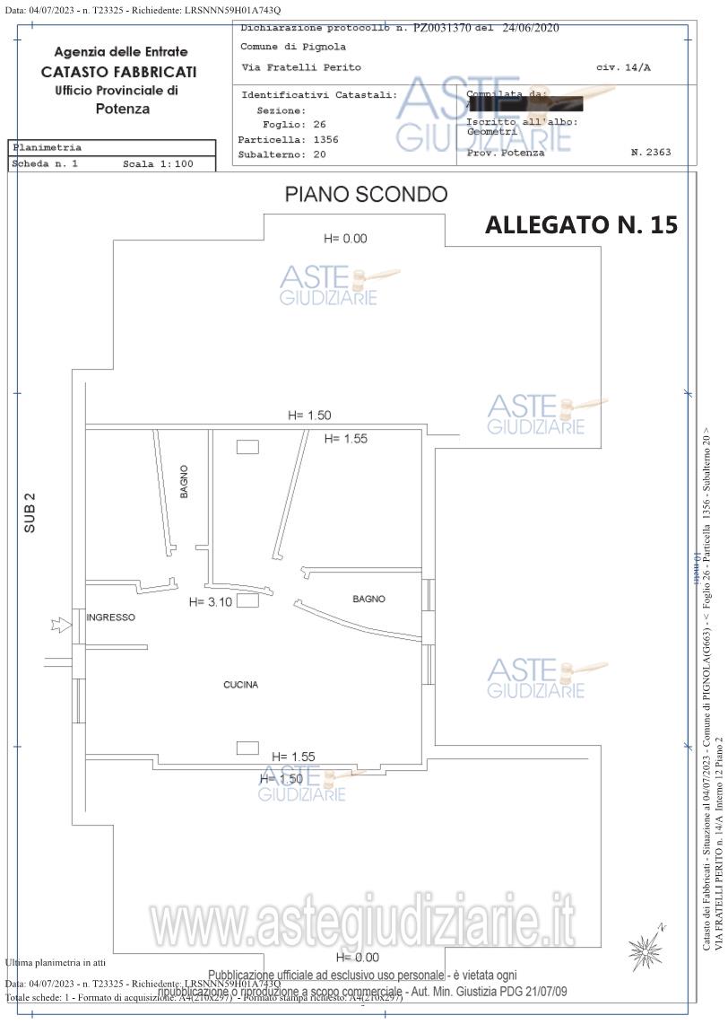 Vendita all'asta Senza incanto, con gara telematica asincrona - LOTTO UNICO: Piena ed intera proprietà con ogni accessorio, accessione e dipendenza, con tutte le servitù attive e passive, di un appartamento per civile abitazione ubicato in Pignola (PZ), alla Via F.lli Perito n. 14/A, piano secondo, int. 12. L’immobile è riportato nel Catasto Fabbricati del Comune di Pignola (PZ) al foglio 26, part. 1356, sub 20, categoria A/2, classe 4, vani 5,5, piano secondo, interno 12, superficie catastale mq. 100, Rendita Catastale € 383,47. Immobile occupato. Prezzo base € 63.282,00 (offerta minima € 47.462,00). Data inizio operazioni di vendita: 17/07/2026 ore 11:00. Professionista delegato alla vendita: Avv. Giuseppe Lofrano - Email "LOFRANOGIUSEPPE@GMAIL.COM"; Tel. 0971/1564190; Cell. 347/3322222.