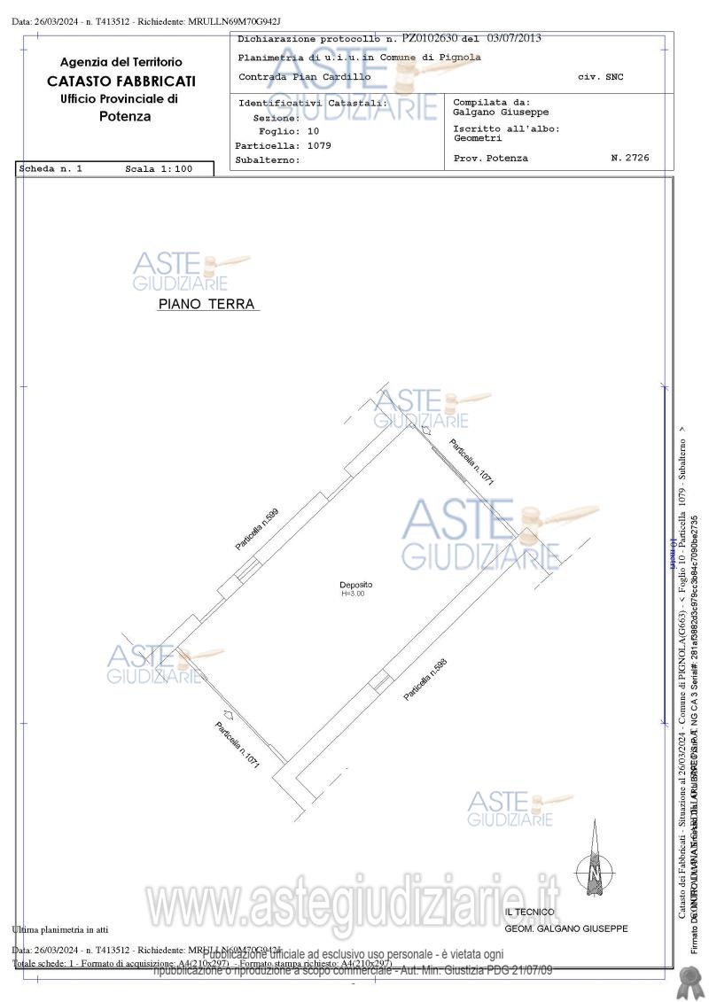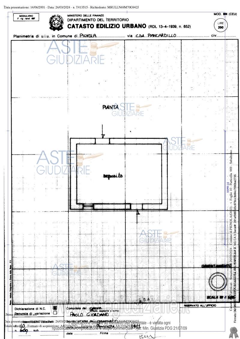 Vendita all'asta Senza incanto - LOTTO 1: Piena proprietà quota di 1/2 Pignola (PZ) alla C/da Pian Cardillo, terreno con entrostanti fabbricati, composti da un’abitazione principale e da locali utilizzati come depositi di attrezzature e macchinari agricoli e per il ricovero di animali domestici, riportati nel Catasto Fabbricati:-fg.10 part. 598, Cat. A/3, -fg. 10 part. 1079, Cat. C/2, (ex p.lla 668)-fg. 10 part. 599, Cat. C/2, -fg. 10 part. 669, Cat. C/2, -fg. 10 part. 600, Cat. C/2,nel Catasto Terreni:-fg. 10 part. 1071,. Prezzo base € 14.459,00 (offerta minima € 10.845,00). Data vendita 26/06/2026 ore 12:00. Professionista delegato alla vendita Avv. Monica Dea De Luca - Email "avv.monicadeadeluca@gmail.com"; Cell. 3385971550; Tel. 0971287426. Custode Giudiziario Avv. Monica Dea De Luca - Email "avv.monicadeadeluca@gmail.com"; Cell. 3385971550; Tel. 0971287426. Rif. Tribunale di Potenza - Esecuzione immobiliare post legge 80 n. 80/1997